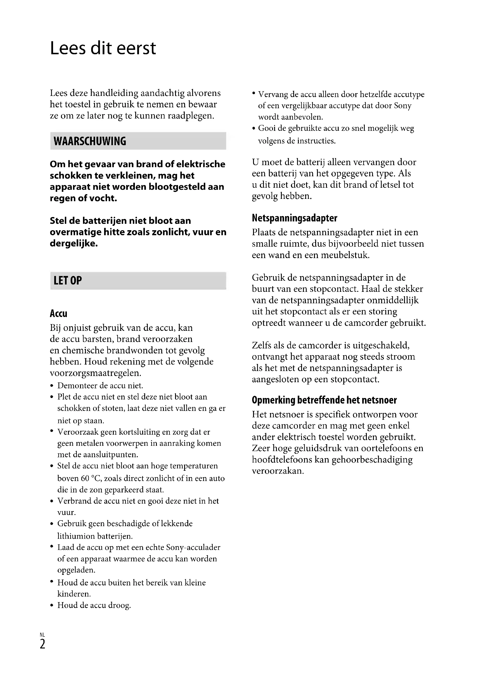 Lees dit eerst Lees deze handleiding aandachtig alvorens het toestel in gebruik te nemen en bewaar ze om ze later nog te kunnen raadplegen. WAARSCHUWING Om het gevaar van brand of elektrische schokken te verkleinen, mag het apparaat niet worden blootgesteld aan regen of vocht. Stel de batterijen niet bloot aan overmatige hitte zoals zonlicht, vuur en dergelijke. LET OP Accu Bij onjuist gebruik van de accu, kan de accu barsten, brand veroorzaken en chemische brandwonden tot gevolg hebben. Houd rekening met de volgende voorzorgsmaatregelen. Demonteer de accu niet.Plet de accu niet en stel deze niet bloot aan schokken of stoten, laat deze niet vallen en ga er niet op staan.Veroorzaak geen kortsluiting en zorg dat er geen metalen voorwerpen in aanraking komen met de aansluitpunten.Stel de accu niet bloot aan hoge temperaturen boven 60 °C, zoals direct zonlicht of in een auto die in de zon geparkeerd staat.Verbrand de accu niet en gooi deze niet in het vuur.Gebruik geen beschadigde of lekkende lithiumion batterijen.Laad de accu op met een echte Sony-acculader of een apparaat waarmee de accu kan worden opgeladen.Houd de accu buiten het bereik van kleine kinderen.Houd de accu droog.