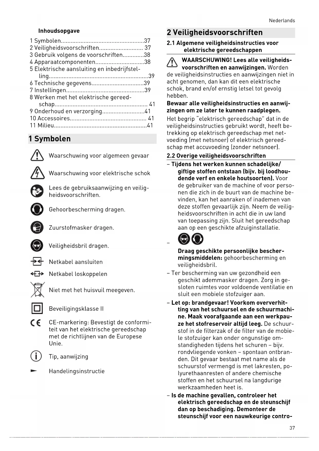 Draag geschikte persoonlijke bescher mingsmiddelen: gehoorbescherming en veiligheidsbril. – Ter bescherming van uw gezondheid een geschikt ademmasker dragen. Zorg in ge sloten ruimtes voor voldoende ventilatie en sluit een mobiele stofzuiger aan. – Let op: brandgevaar! Voorkom oververhit ting van het schuursel en de schuurmachi ne. Maak voorafgaande aan een werkpau ze het stofreservoir altijd leeg. De schuur stof in de filterzak of de filter van de mobie le stofzuiger kan onder ongunstige om standigheden tijdens het schuren – bijv. rondvliegende vonken – spontaan ontbran den. Dit gevaar bestaat met name als de schuurstof vermengd is met lakresten, po lyurethaanresten of andere chemische stoffen en het schuursel na langdurige werkzaamheden heet is. – Is de machine gevallen, controleer het elektrisch gereedschap en de steunschijf dan op beschadiging. Demonteer de steunschijf voor een nauwkeurige contro Nederlands 37le. Laat de beschadigde onderdelen voor gebruik repareren. Gebroken steunschij ven en beschadigde machines kunnen tot letsel en onveiligheid leiden. – Reinig in olie gedrenkt werkmateriaal zoals schuurpads en polijstvilten met wa ter en laat ze uitgespreid drogen. In olie gedrenkt werkmateriaal kan spontaan ont branden.