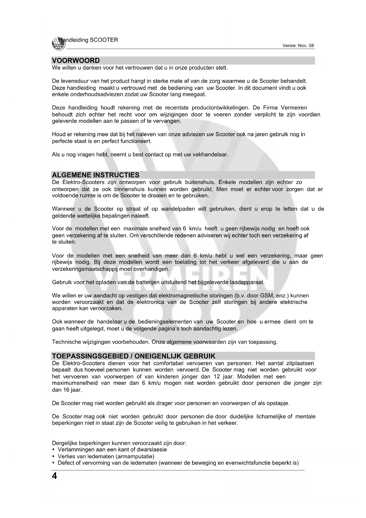Deze handleiding houdt rekening met de recentste productontwikkelingen. De Firma Vermeiren behoudt zich echter het recht voor om wijzigingen door te voeren zonder verplicht te zijn voordien geleverde modellen aan te passen of te vervangen. Houd er rekening mee dat bij het naleven van onze adviezen uw Scooter ook na jaren gebruik nog in perfecte staat is en perfect functioneert. Als u nog vragen hebt, neemt u best contact op met uw vakhandelaar.
