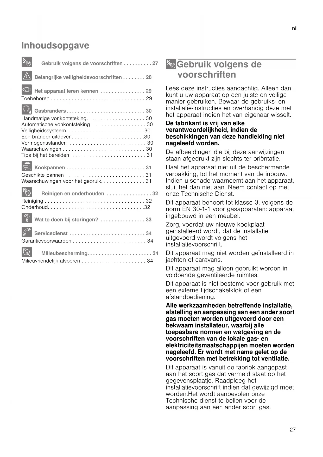 - Het apparaat leren kennen . . . . . . . . . . . . . . . . 29 Toebehoren . . . . . . . . . . . . . . . . . . . . . . . . . . . . . . . . 29 Ä Gasbranders. . . . . . . . . . . . . . . . . . . . . . . . . . . . 30 Handmatige vonkontsteking. . . . . . . . . . . . . . . . . . . . 30 Automatische vonkontsteking . . . . . . . . . . . . . . . . . . 30 Veiligheidssysteem. . . . . . . . . . . . . . . . . . . . . . . . . . .30 Een brander uitdoven. . . . . . . . . . . . . . . . . . . . . . . . .30 Vermogensstanden . . . . . . . . . . . . . . . . . . . . . . . . . . 30 Waarschuwingen . . . . . . . . . . . . . . . . . . . . . . . . . . . . 30 Tips bij het bereiden . . . . . . . . . . . . . . . . . . . . . . . . . 31 Å Kookpannen . . . . . . . . . . . . . . . . . . . . . . . . . . . . 31 Geschikte pannen . . . . . . . . . . . . . . . . . . . . . . . . . . . 31 Waarschuwingen voor het gebruik. . . . . . . . . . . . . . . 31 2 Reinigen en onderhouden . . . . . . . . . . . . . . . . 32 Reiniging . . . . . . . . . . . . . . . . . . . . . . . . . . . . . . . . . . 32 Onderhoud. . . . . . . . . . . . . . . . . . . . . . . . . . . . . . . . .32 3 Wat te doen bij storingen? . . . . . . . . . . . . . . . . 33 4 Servicedienst . . . . . . . . . . . . . . . . . . . . . . . . . . . 34 Garantievoorwaarden . . . . . . . . . . . . . . . . . . . . . . . . . 34 7 Milieubescherming. . . . . . . . . . . . . . . . . . . . . . . 34 Milieuvriendelijk afvoeren . . . . . . . . . . . . . . . . . . . . . . 34 8Gebruik volgens de voorschriften Gebruik volgens de voorschriften Lees deze instructies aandachtig. Alleen dan kunt u uw apparaat op een juiste en veilige manier gebruiken. Bewaar de gebruiks- en installatie-instructies en overhandig deze met het apparaat indien het van eigenaar wisselt. De fabrikant is vrij van elke verantwoordelijkheid, indien de beschikkingen van deze handleiding niet nageleefd worden. De afbeeldingen die bij deze aanwijzingen staan afgedrukt zijn slechts ter oriëntatie. Haal het apparaat niet uit de beschermende verpakking, tot het moment van de inbouw. Indien u schade waarneemt aan het apparaat, sluit het dan niet aan. Neem contact op met onze Technische Dienst. Dit apparaat behoort tot klasse 3, volgens de norm EN 30-1-1 voor gasapparaten: apparaat ingebouwd in een meubel. Zorg, voordat uw nieuwe kookplaat geïnstalleerd wordt, dat de installatie uitgevoerd wordt volgens het installatievoorschrift. Dit apparaat mag niet worden geïnstalleerd in jachten of caravans. Dit apparaat mag alleen gebruikt worden in voldoende geventileerde ruimtes. Dit apparaat is niet bestemd voor gebruik met een externe tijdschakelklok of een afstandbediening. Alle werkzaamheden betreffende installatie, afstelling en aanpassing aan een ander soort gas moeten worden uitgevoerd door een bekwaam installateur, waarbij alle toepasbare normen en wetgeving en de voorschriften van de lokale gas- en elektriciteitsmaatschappijen moeten worden nageleefd. Er wordt met name gelet op de voorschriften met betrekking tot ventilatie. Dit apparaat is vanuit de fabriek aangepast aan het soort gas dat vermeld staat op het gegevensplaatje. Raadpleeg het installatievoorschrift indien dat gewijzigd moet worden.Het wordt aanbevolen onze Technische dienst te bellen voor de aanpassing aan een ander soort gas.nl Belangrijke veiligheidsvoorschriften