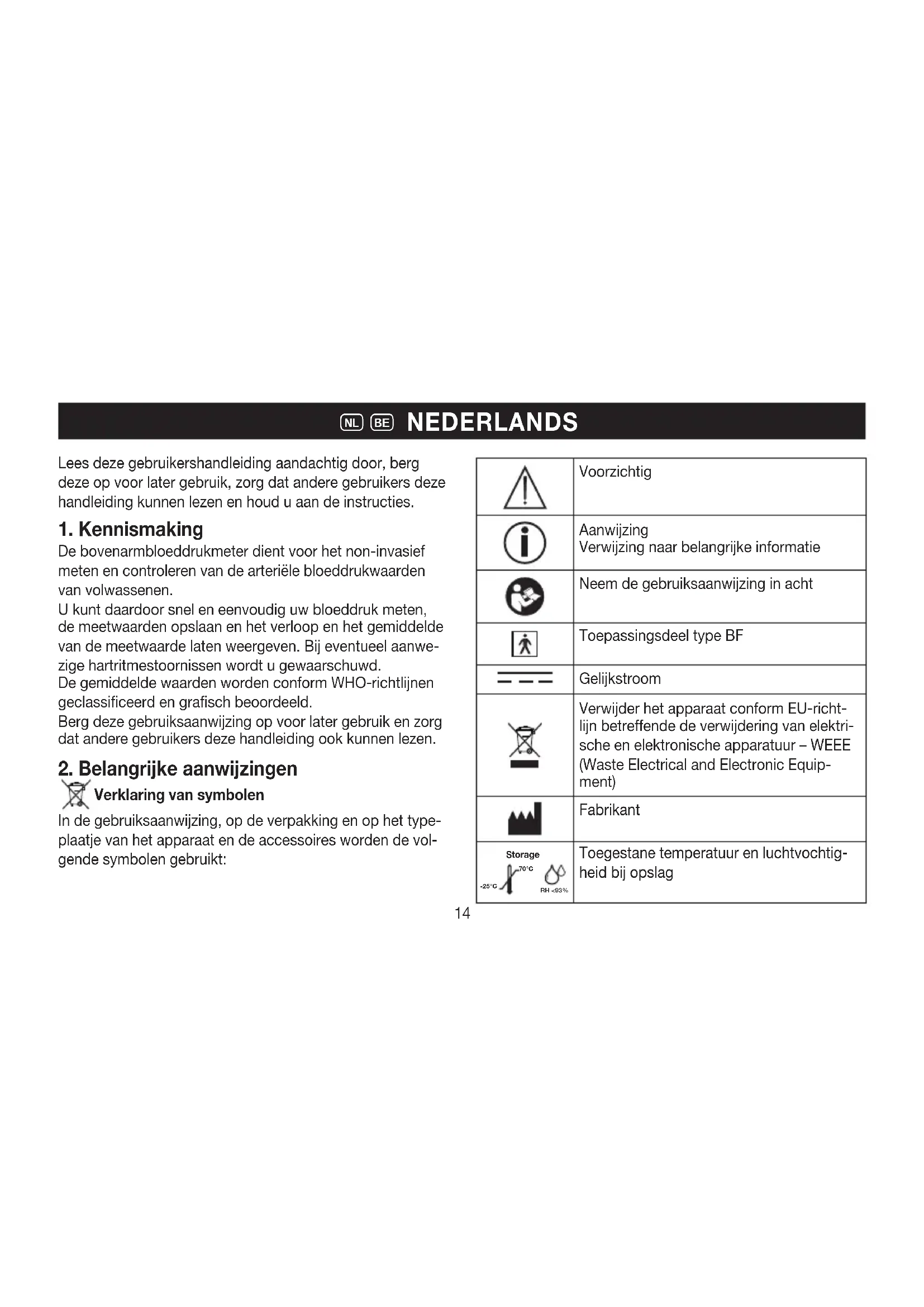 Verklaring van symbolen In de gebruiksaanwijzing, op de verpakking en op het type- plaatje van het apparaat en de accessoires worden de vol- gende symbolen gebruikt: Voorzichtig Aanwijzing Verwijzing naar belangrijke informatie Neem de gebruiksaanwijzing in acht Toepassingsdeel type BF Gelijkstroom Verwijder het apparaat conform EU-richt- lijn betreffende de verwijdering van elektri- sche en elektronische apparatuur – WEEE (Waste Electrical and Electronic Equip- ment) Fabrikant Storage RH <93% -25°C 70°C Toegestane temperatuur en luchtvochtig- heid bij opslag O ) NEDERLANDS15 Operating 5°C 40°C RH 15-93% Toegestane temperatuur en luchtvochtig- heid bij gebruik Niet blootstellen aan vocht SN Serienummer