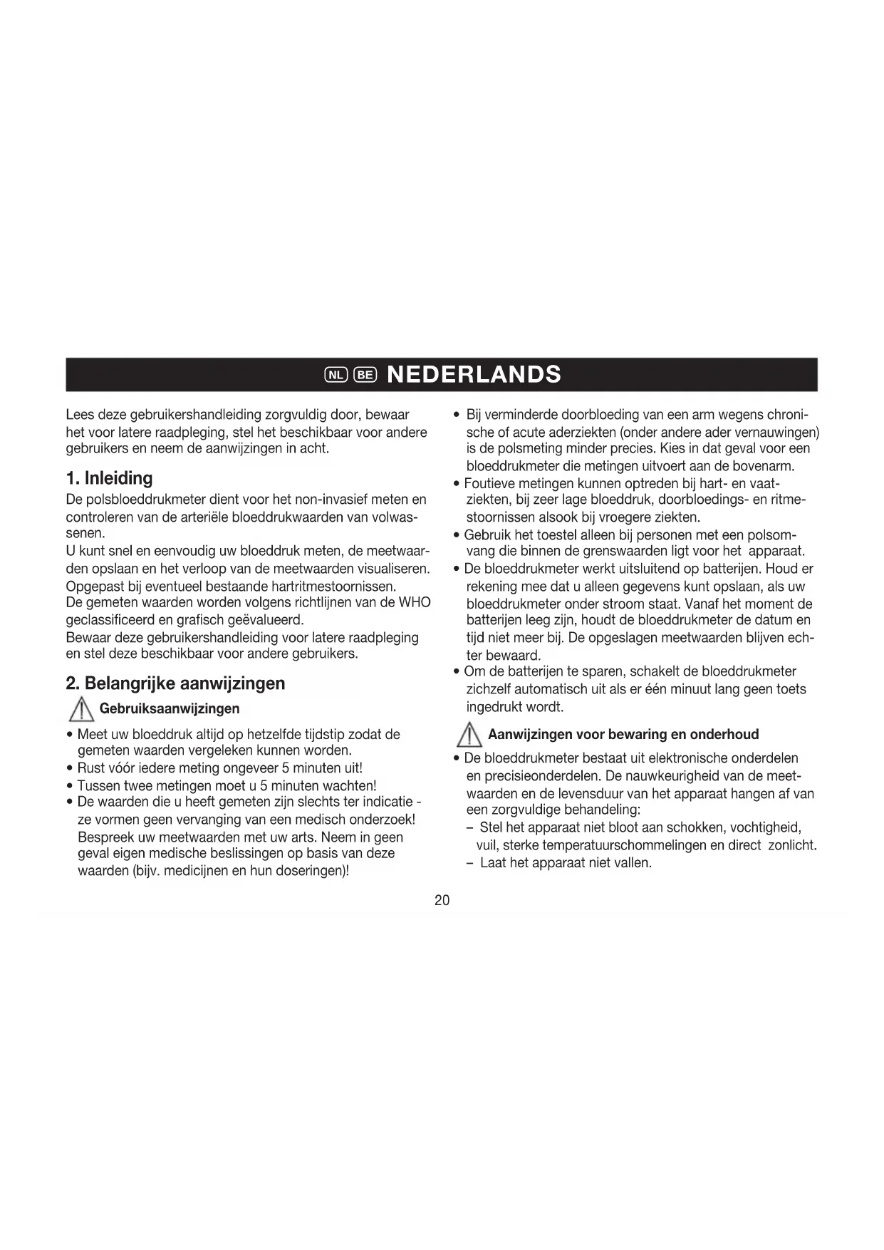 De polsbloeddrukmeter dient voor het non-invasief meten en controleren van de arteriële bloeddrukwaarden van volwas- senen. U kunt snel en eenvoudig uw bloeddruk meten, de meetwaar- den opslaan en het verloop van de meetwaarden visualiseren. Opgepast bij eventueel bestaande hartritmestoornissen. De gemeten waarden worden volgens richtlijnen van de WHO geclassificeerd en grafisch geëvalueerd. Bewaar deze gebruikershandleiding voor latere raadpleging en stel deze beschikbaar voor andere gebruikers.