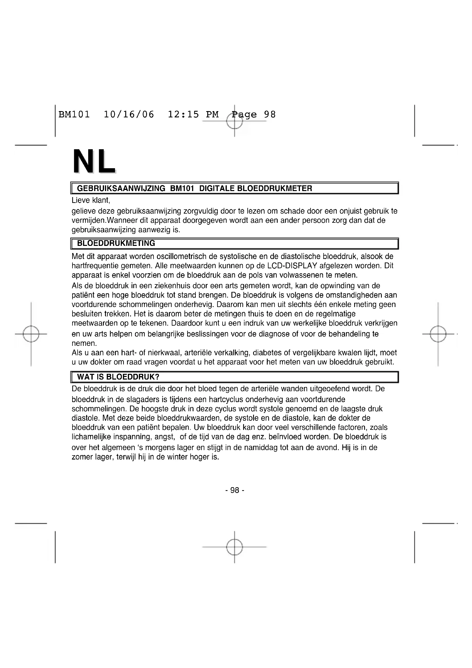 Lieve klant, gelieve deze gebruiksaanwijzing zorgvuldig door te lezen om schade door een onjuist gebruik te vermijden.Wanneer dit apparaat doorgegeven wordt aan een ander persoon zorg dan dat de gebruiksaanwijzing aanwezig is. BLOEDDRUKMETING Met dit apparaat worden oscillometrisch de systolische en de diastolische bloeddruk, alsook de hartfrequentie gemeten. Alle meetwaarden kunnen op de LCD-DISPLAY afgelezen worden. Dit apparaat is enkel voorzien om de bloeddruk aan de pols van volwassenen te meten. Als de bloeddruk in een ziekenhuis door een arts gemeten wordt, kan de opwinding van de patiënt een hoge bloeddruk tot stand brengen. De bloeddruk is volgens de omstandigheden aan voortdurende schommelingen onderhevig. Daarom kan men uit slechts één enkele meting geen besluiten trekken. Het is daarom beter de metingen thuis te doen en de regelmatige meetwaarden op te tekenen. Daardoor kunt u een indruk van uw werkelijke bloeddruk verkrijgen en uw arts helpen om belangrijke beslissingen voor de diagnose of voor de behandeling te nemen. Als u aan een hart- of nierkwaal, arteriële verkalking, diabetes of vergelijkbare kwalen lijdt, moet u uw dokter om raad vragen voordat u het apparaat voor het meten van uw bloeddruk gebruikt. WAT IS BLOEDDRUK? De bloeddruk is de druk die door het bloed tegen de arteriële wanden uitgeoefend wordt. De bloeddruk in de slagaders is tijdens een hartcyclus onderhevig aan voortdurende schommelingen. De hoogste druk in deze cyclus wordt systole genoemd en de laagste druk diastole. Met deze beide bloeddrukwaarden, de systole en de diastole, kan de dokter de bloeddruk van een patiënt bepalen. Uw bloeddruk kan door veel verschillende factoren, zoals lichamelijke inspanning, angst, of de tijd van de dag enz. beïnvloed worden. De bloeddruk is over het algemeen ‘s morgens lager en stijgt in de namiddag tot aan de avond. Hij is in de zomer lager, terwijl hij in de winter hoger is. BM101 10/16/06 12:15 PM Page 98- 99 -