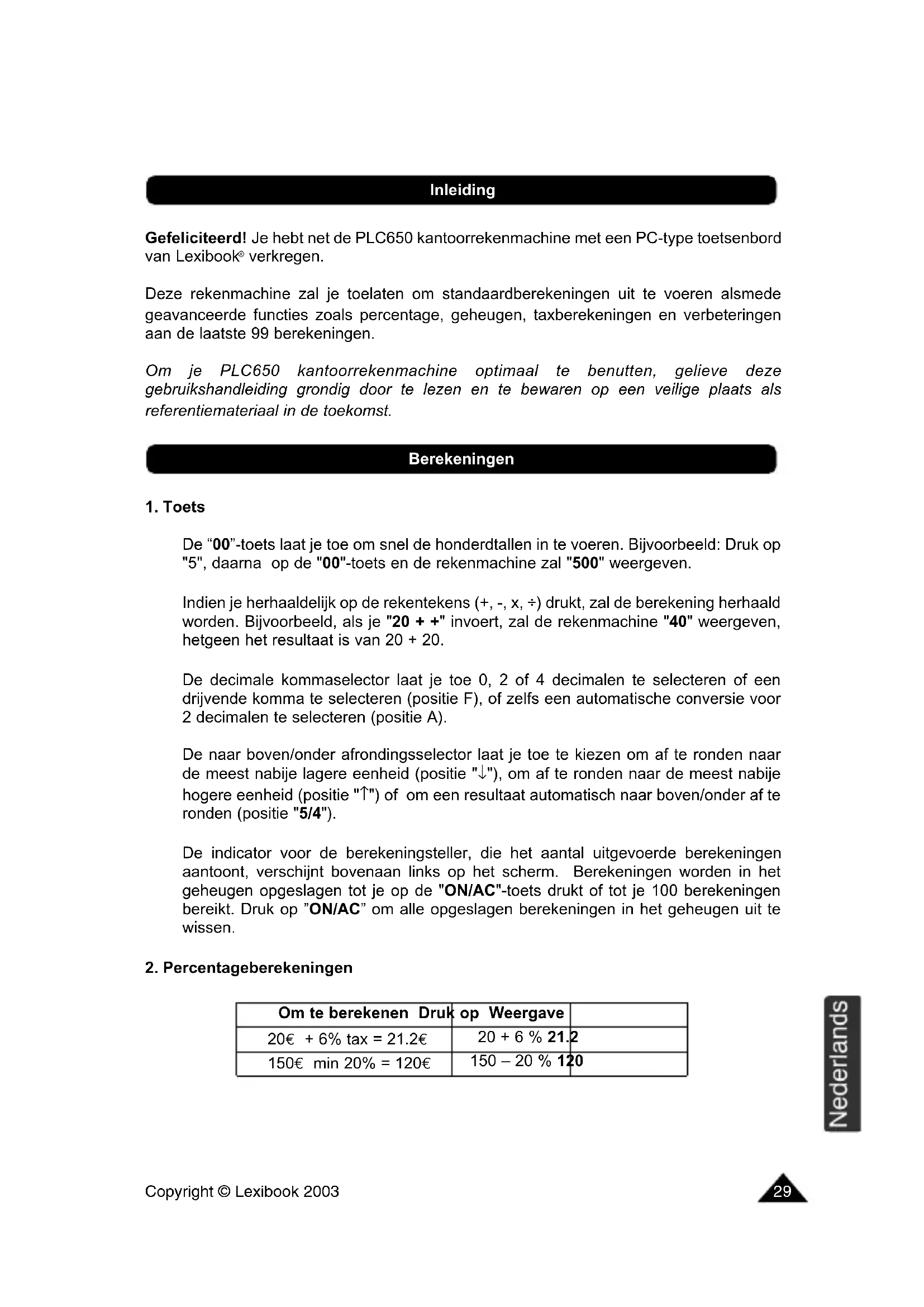 ◗ Gooi nooit batterijen, het schermp of andere componenten in een vuur. ◗ Indien de rekenmachine wordt blootgesteld aan een hoge electrostatische ontlading, kan de inhoud van het geheugen schade oplopen of kan het zijn dat de toetsen niet meer functioneren. ◗ Alvorens te veronderstellen dat het toestel niet meer werkt, zorg ervoor deze handleiding grondig te lezen en controleer of het probleem niet is veroorzaakt door zwakke batterijen of foutieve berekeningen. Voeding: 2x 1.5 (AAA of LR44) batterij en zonnecel. Automatische uitschakelfunctie: Als er geen toets wordt ingedrukt, zal de rekenmachine zichzelf automatisch uitschakelen na ongeveer 6 minuten. Dit product wordt gedekt door onze waarborg van twee jaar. Om gebruik te maken van de waarborg of van de servicedienst moet u met uw aankoopbewijs naar uw winkelier gaan. Onze waarborg dekt materiaal- of montagefouten die te wijten zijn aan de constructeur, met uitzondering van elke beschadiging die ontstaan is omdat de gebruiksaanwijzing niet is nageleefd of omdat er een ongepaste ingreep is uitgevoerd (zoals demontage, blootstelling aan warmte of vocht, …). Telefoon technische bijstand: 0821 23 3000 (0,12 € incl. btw/min.) Fax: + 33 (0)1 73 23 23 04 Website: http://www.lexibook.com ◗ De inhoud van deze handleiding kan veranderen zonder voorafgaande aankondiging. ◗ Niets uit deze handleiding mag op wat voor wijze dan ook worden verveelvoudigd zonder uitdrukkelijke schriftelijke toestemming van de fabrikant. Waarborg KarakteristiekenCopyright © Lexibook 2003