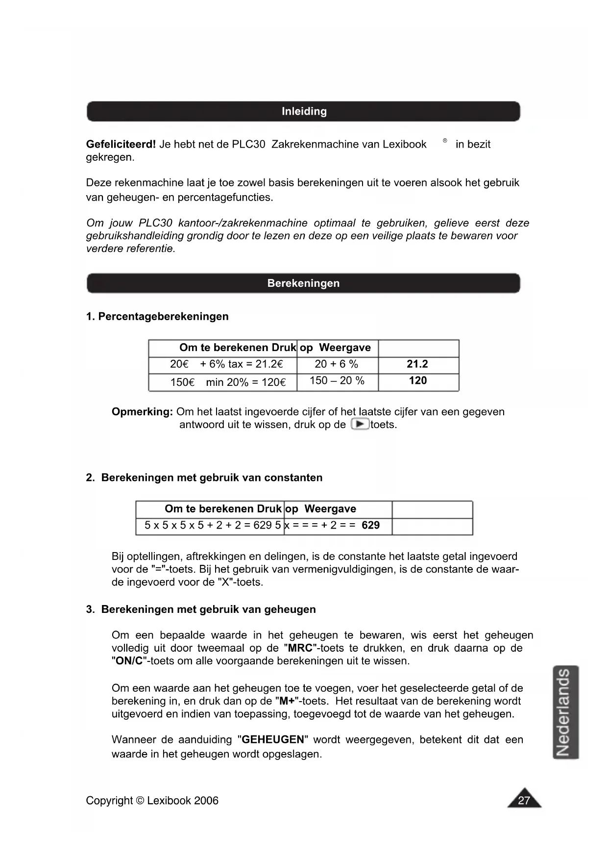 Om een bepaalde waarde in het geheugen te bewaren, wis eerst het geheugen volledig uit door tweemaal op de "MRC"-toets te drukken, en druk daarna op de "ON/C"-toets om alle voorgaande berekeningen uit te wissen. Om een waarde aan het geheugen toe te voegen, voer het geselecteerde getal of de berekening in, en druk dan op de "M+"-toets. Het resultaat van de berekening wordt uitgevoerd en indien van toepassing, toegevoegd tot de waarde van het geheugen. Wanneer de aanduiding "GEHEUGEN" wordt weergegeven, betekent dit dat een waarde in het geheugen wordt opgeslagen. Om te berekenen Druk op Weergave 5 x 5 x 5 x 5 + 2 + 2 = 629 5 x = = = + 2 = = 629 Om te berekenen Druk op Weergave 20€ + 6% tax = 21.2€ 20 + 6 % 21.2 150€ min 20% = 120€ 150 – 20 % 120 Berekeningen InleidingCopyright © Lexibook 2006