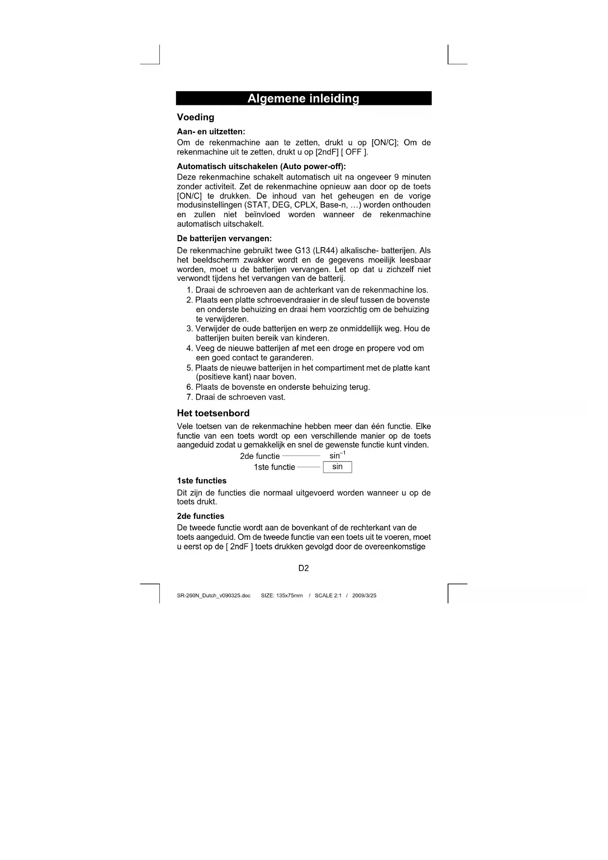 sin 1ste functies Dit zijn de functies die normaal uitgevoerd worden wanneer u op de toets drukt. 2de functies De tweede functie wordt aan de bovenkant of de rechterkant van de toets aangeduid. Om de tweede functie van een toets uit te voeren, moet u eerst op de [ 2ndF ] toets drukken gevolgd door de overeenkomstigeSR-260N_Dutch_v090325.doc SIZE: 135x75mm / SCALE 2:1 / 2009/3/25