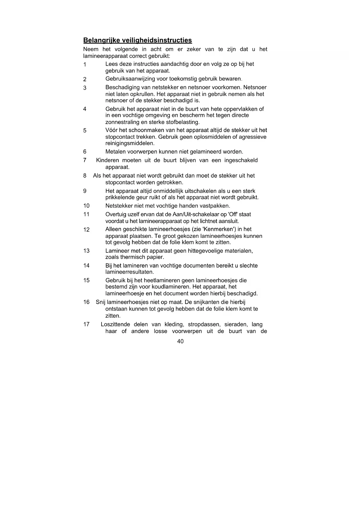 13 Lamineer met dit apparaat geen hittegevoelige materialen, zoals thermisch papier.