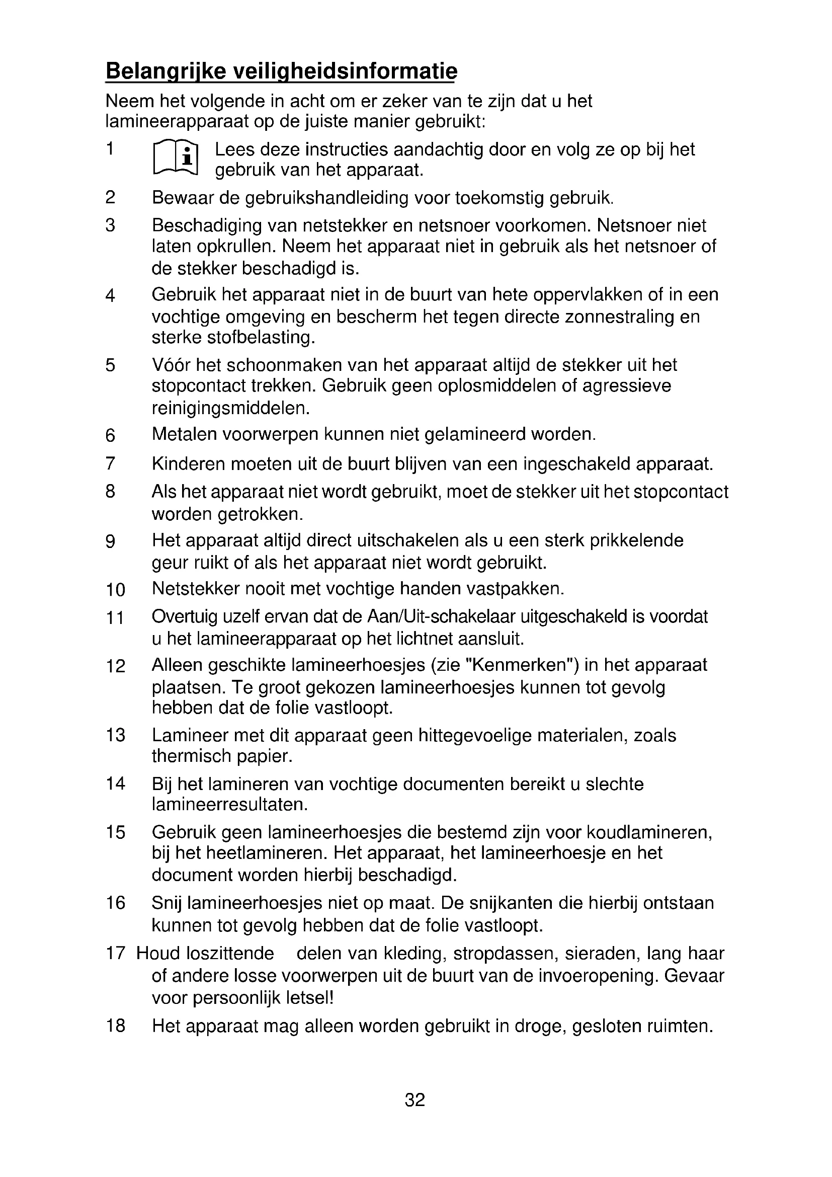 Gebruik geen lamineerhoesjes die bestemd zijn voor koudlamineren, bij het heetlamineren. Het apparaat, het lamineerhoesje en het document worden hierbij beschadigd. 16 Snij lamineerhoesjes niet op maat. De snijkanten die hierbij ontstaan kunnen tot gevolg hebben dat de folie vastloopt. 17 Houd loszittende delen van kleding, stropdassen, sieraden, lang haar of andere losse voorwerpen uit de buurt van de invoeropening. Gevaar voor persoonlijk letsel!