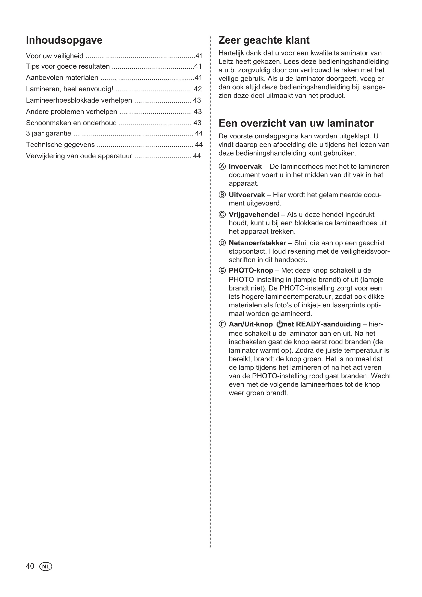 - Aan/Uit-knop met READY-aanduiding – hier- mee schakelt u de laminator aan en uit. Na het inschakelen gaat de knop eerst rood branden (de laminator warmt op). Zodra de juiste temperatuur is bereikt, brandt de knop groen. Het is normaal dat de lamp tijdens het lamineren of na het activeren van de PHOTO-instelling rood gaat branden. Wacht even met de volgende lamineerhoes tot de knop weer groen brandt. Inhoudsopgave Voor uw veiligheid p. 41