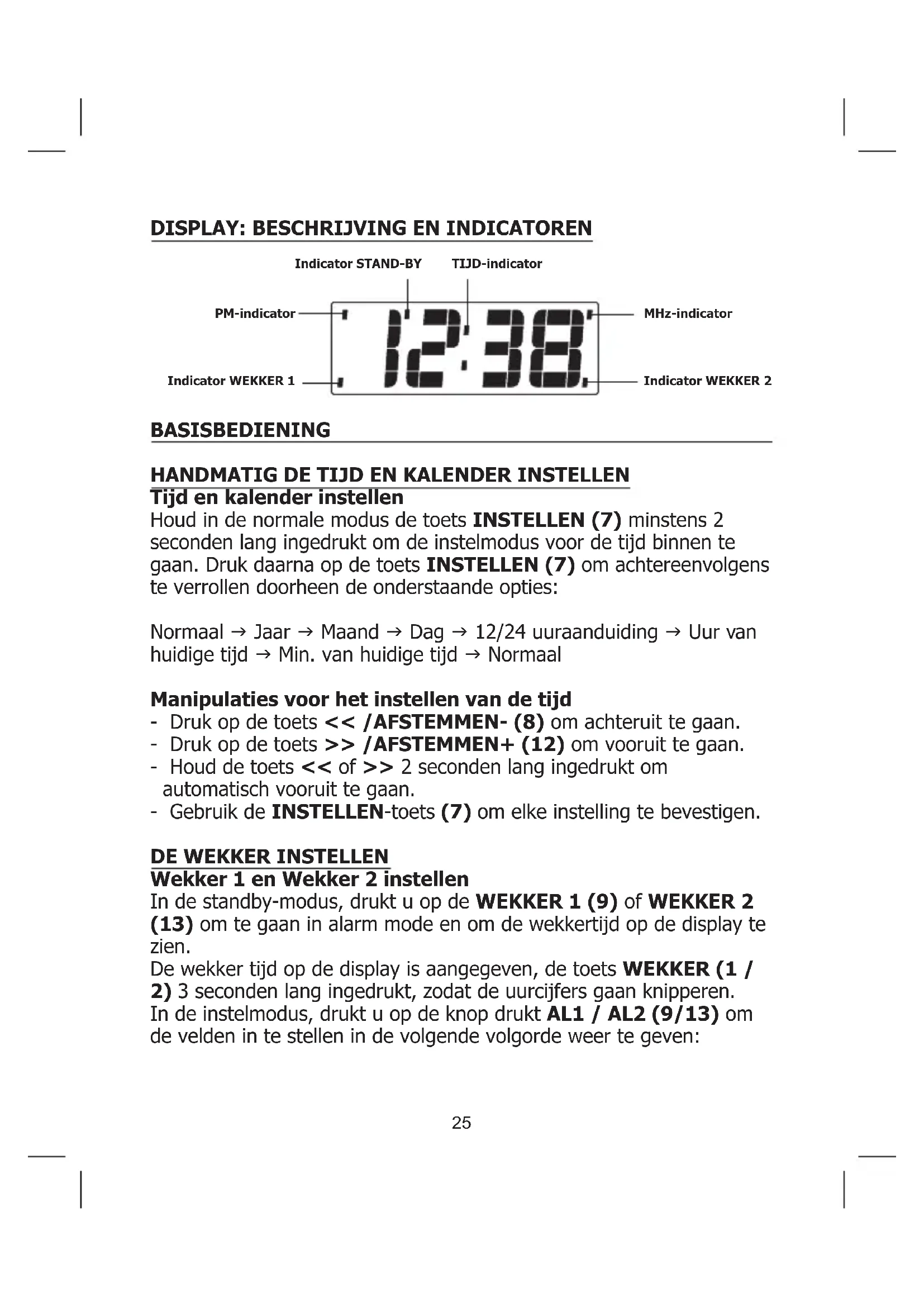 Tijd en kalender instellen Houd in de normale modus de toets INSTELLEN (7) minstens 2 seconden lang ingedrukt om de instelmodus voor de tijd binnen te gaan. Druk daarna op de toets INSTELLEN (7) om achtereenvolgens te verrollen doorheen de onderstaande opties: Normaal g Jaar g Maand g Dag g 12/24 uuraanduiding g Uur van huidige tijd g Min. van huidige tijd g Normaal Manipulaties voor het instellen van de tijd - Druk op de toets << /AFSTEMMEN- (8) om achteruit te gaan. - Druk op de toets >> /AFSTEMMEN+ (12) om vooruit te gaan. - Houd de toets << of >> 2 seconden lang ingedrukt om automatisch vooruit te gaan. - Gebruik de INSTELLEN-toets (7) om elke instelling te bevestigen.