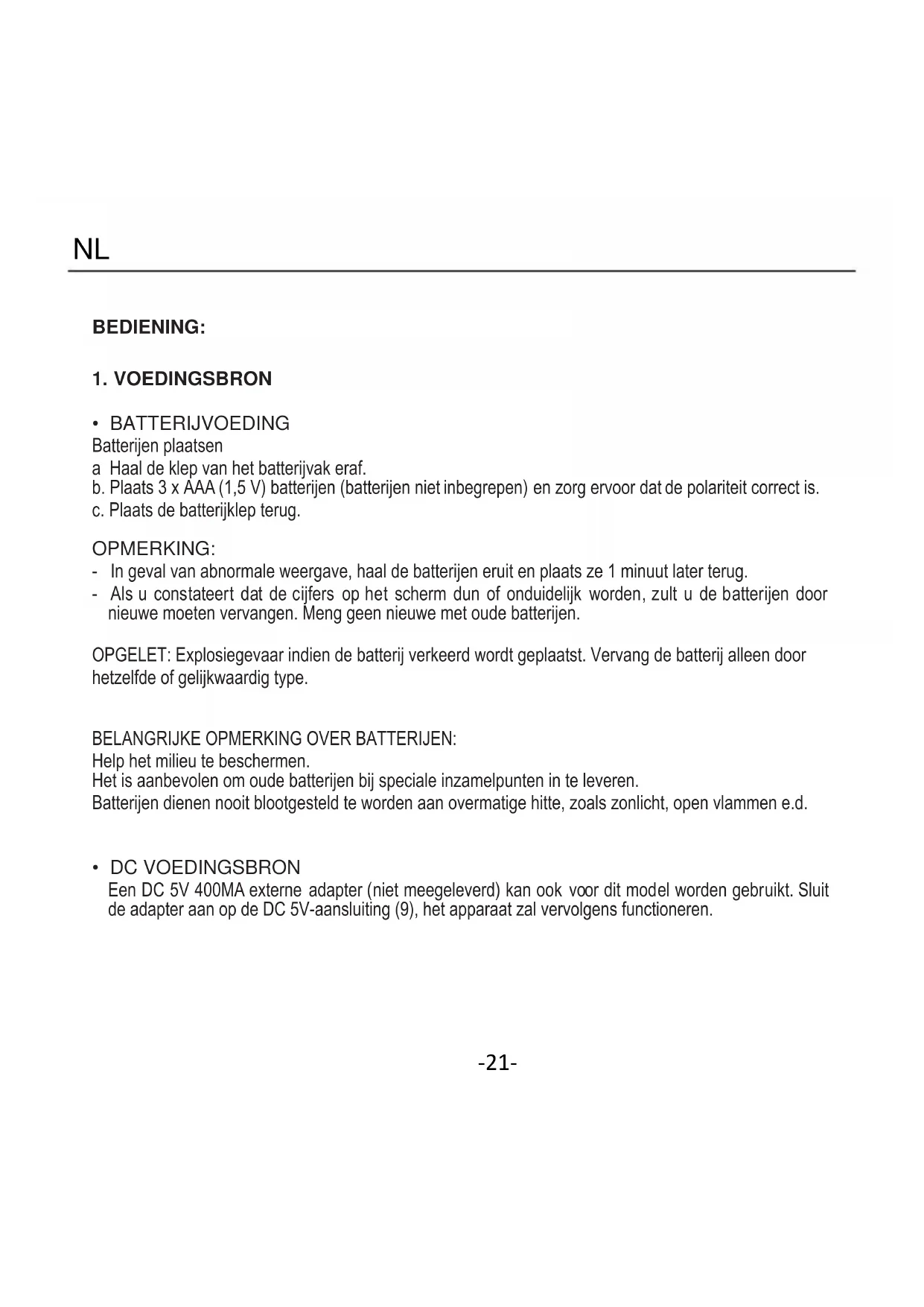 - BATTERIJVOEDING Batterijen plaatsen a Haal de klep van het batterijvak eraf. b. Plaats 3 x AAA (1,5 V) batterijen (batterijen niet inbegrepen) en zorg ervoor dat de polariteit correct is. c. Plaats de batterijklep terug. OPMERKING: - In geval van abnormale weergave, haal de batterijen eruit en plaats ze 1 minuut later terug. - Als u constateert dat de cijfers op het scherm dun of onduidelijk worden, zult u de batterijen door nieuwe moeten vervangen. Meng geen nieuwe met oude batterijen. OPGELET: Explosiegevaar indien de batterij verkeerd wordt geplaatst. Vervang de batterij alleen door hetzelfde of gelijkwaardig type. BELANGRIJKE OPMERKING OVER BATTERIJEN: Help het milieu te beschermen. Het is aanbevolen om oude batterijen bij speciale inzamelpunten in te leveren. Batterijen dienen nooit blootgesteld te worden aan overmatige hitte, zoals zonlicht, open vlammen e.d.