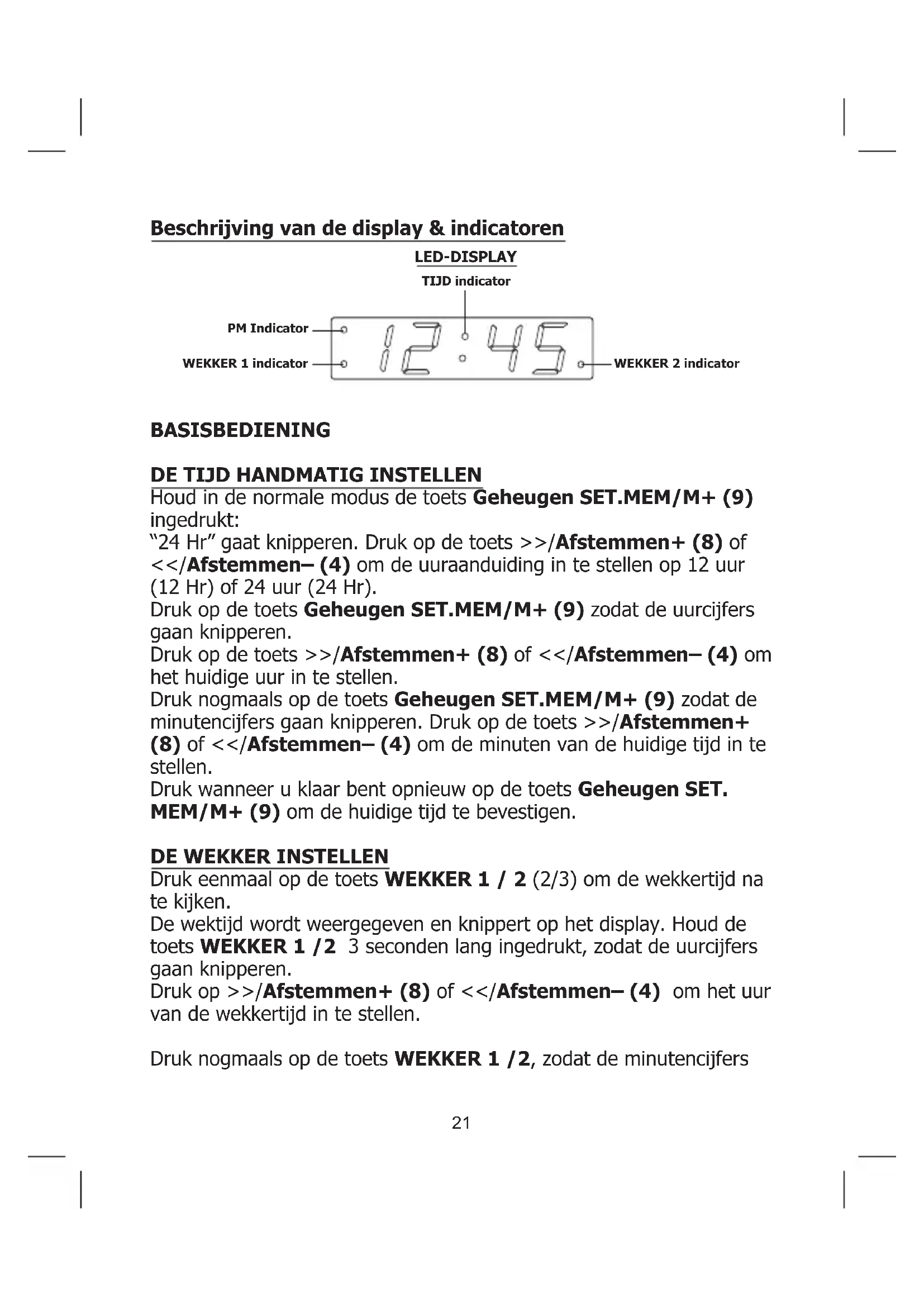 Houd in de normale modus de toets Geheugen SET.MEM/M+ (9) ingedrukt: “24 Hr” gaat knipperen. Druk op de toets >>/Afstemmen+ (8) of <</Afstemmen– (4) om de uuraanduiding in te stellen op 12 uur (12 Hr) of 24 uur (24 Hr). Druk op de toets Geheugen SET.MEM/M+ (9) zodat de uurcijfers gaan knipperen. Druk op de toets >>/Afstemmen+ (8) of <</Afstemmen– (4) om het huidige uur in te stellen. Druk nogmaals op de toets Geheugen SET.MEM/M+ (9) zodat de minutencijfers gaan knipperen. Druk op de toets >>/Afstemmen+ (8) of <</Afstemmen– (4) om de minuten van de huidige tijd in te stellen. Druk wanneer u klaar bent opnieuw op de toets Geheugen SET. MEM/M+ (9) om de huidige tijd te bevestigen.