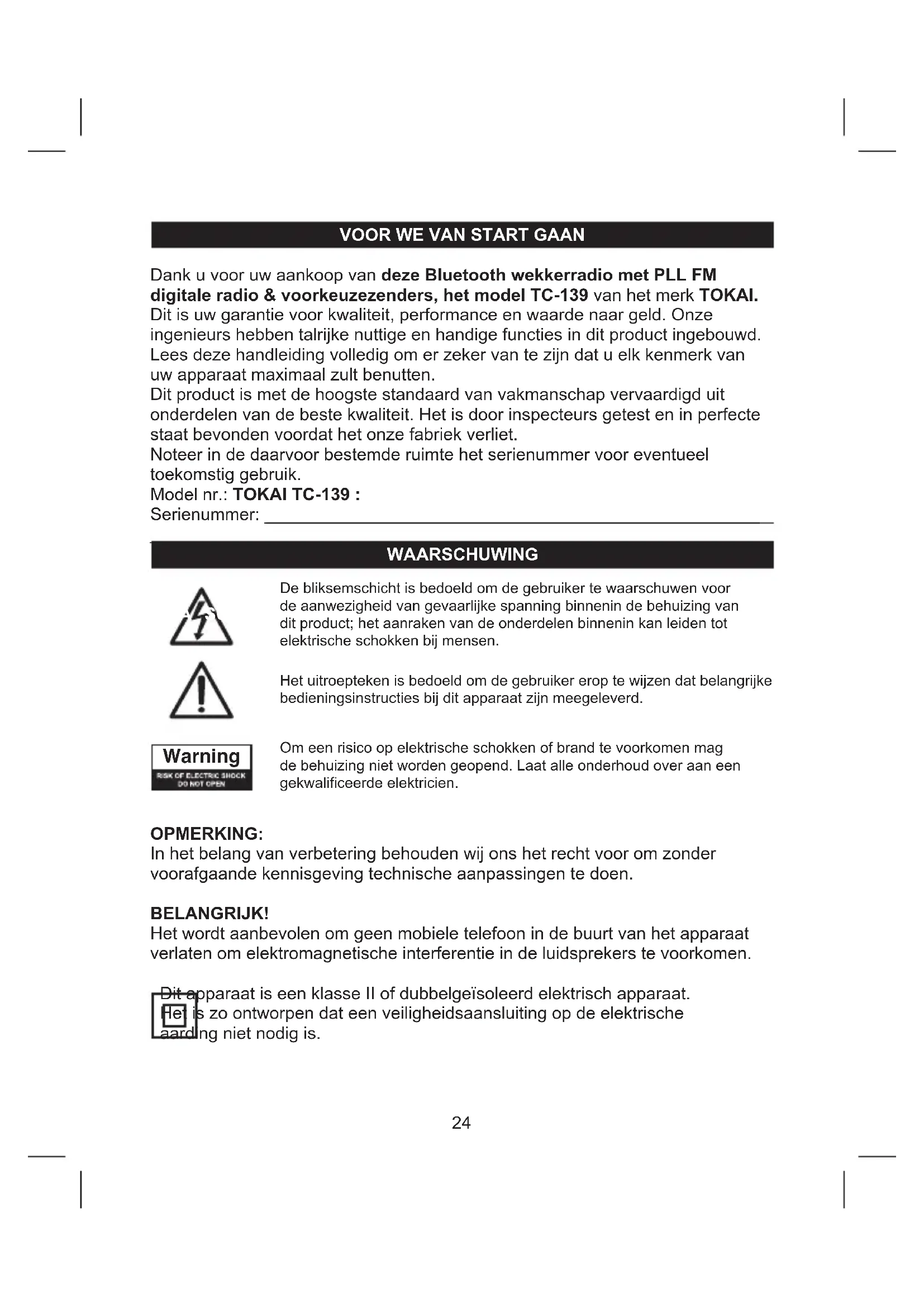 WEGDOEN NA HET EINDE VAN DE LEVENSDUUR Let op : Dit symbool geeft aan dat elektrische en elektronische apparatuur, aan het eind van hun levensduur, niet mag worden gedeponeerd bij het normale huishoudelijk afval Uw product is van dit merkteken voorzien. Dit betekent dat en elektronische apparatuur niet samen met afgedankte elektrische het normale huisafval mogen worden weggegooid. Er bestaat een afzonderlijk inzamelingssysteem voor deze producten. (Afgedankte Electrische & Electronische Apparatuur (WEEE). - Uw product is ontworpen en vervaardigd met hoge kwaliteit materialen en componenten welke kunnen worden gerecycled en opnieuw gebruikt. (WEEE aanwijzing). - Afgedankte elektrische en elektronische apparatuur moet gescheiden worden ingezameld conform de wetgeving inzake de verantwoorde verwerking, terugwinning en recycling van afgedankte elektrische en elektronische apparatuur. - In de Europese Unie zijn er afzonderlijke verzamelsystemen voor gebruikte elektrische en elektronische producten. Help ons om het milieu waar we in leven te behouden! Deponeer het product bij het afvalinzamelingbedrijf van uw gemeente. - Als uw elektrische of elektronische apparatuur batterijen of accumulatoren bevat dan moet u deze afzonderlijk conform de plaatselijke voorschriften weggooien. - Door dit product op een verantwoorde manier weg te gooien, zorgt u ervoor dat het afval de juiste verwerking, terugwinning en recycling ondergaat en potentiële negatieve effecten op het milieu en de menselijke gezondheid worden voorkomen die anders zouden ontstaan door het verkeerd verwerken van het afval. Dit apparaat voldoet aan de Europese veiligheid en EMC & LVD richtlijnen 2006 / 95 CEANTES DE COMENZAR Gracias por adquirir el Radio Despertador con Bluetooth, FM Digital PLL y memorias para estaciones TOKAI modelo TC-139. Esta es su garantía de calidad, rendimiento y valor. Nuestros ingenieros han incluido muchas funciones de utilidad y conveniencia en este producto. Asegúrese de leer este Manual de Instrucciones de manera completa a n de obtener los mayores benecios de cada función. Este producto fue fabricado usando los componentes de mayor calidad y estándares de mano de obra. Fue probado por inspectores y encontrado de en perfecto funcionamiento antes de salir nuestra fábrica. Para referencia futura, registre el número de serie en el espacio provisto. Modelo No: TOKAI TC-139 : Número de Serie : NOTA: Nos reservamos el derecho de efectuar cambios técnicos sin aviso, en el interés de la mejora. PRECAUCION Peligro de explosión si la pila es colocada de manera incorrecta. Reemplace solamente con pilas de la misma calidad o del tipo equivalente. IMPORTANTE! Se recomienda no dejar un teléfono móvil cerca de la unidad con el n de evitar la interferencia electromagnética en altavoces. Este equipo es un aparato eléctrico de Clase II o de doble aislamiento. Ha sido diseñado de manera que no requiera conexión eléctrica de cable a tierra.