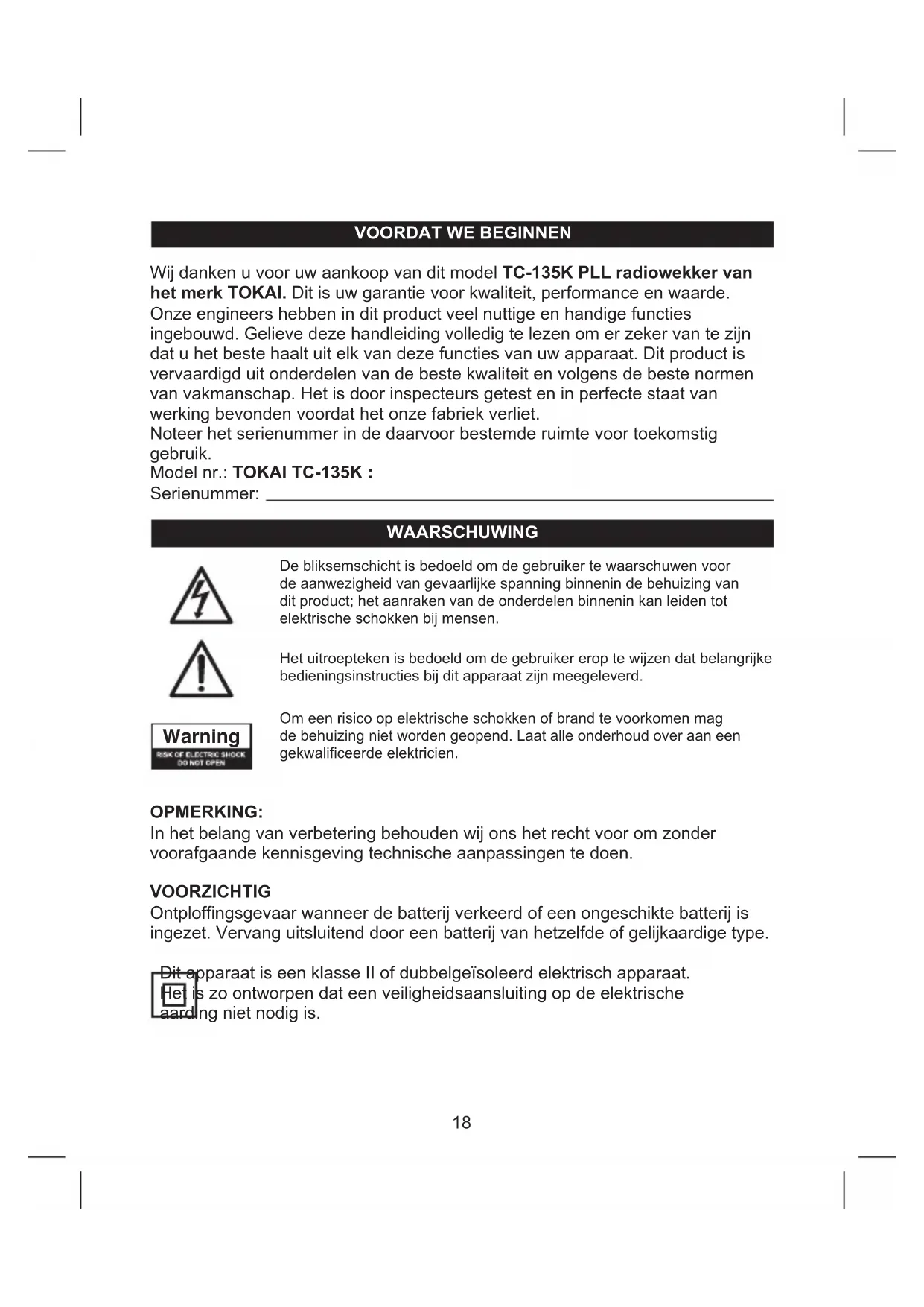 Druk op de toets AAN/UIT (4) om het apparaat IN te schakelen. Gebruik de toets Afstemmen (5) of Afstemmen (1) om de gewenste radiozender op FM te selecteren. Druk op de toets INSTELLEN - GEH/G+ (2), zodat “P02” op de display gaat knipperen. Druk nogmaals op de toets INSTELLEN - GEH/G+ (2) om de voorkeuzezender in te stellen. Herhaal de stappen 2 tot 4 om andere voorkeuzezenders in te stellen. U kunt in totaal 10 radiozenders van FM als voorkeuzezender instellen. Druk terwijl “P01-P10” knippert op de toets Afstemmen (5) of Afstemmen (1) om het nummer van een voorkeuzezender te kiezen.24 Druk om voorkeuzezenders op te roepen op de toets INSTELLEN - GEH/G+ (2) om het nummer van de voorkeuzezender te kiezen. DE SLAAPFUNCTIE Druk terwijl u naar de radio luistert op de toets SLUIMER / SLEEP (3) om de slaapfunctie te activeren. U kunt de slaaptimer instellen tussen 90 min. en 10 min. door te drukken op de toets SLUIMER / SLEEP (3). Het toestel schakelt na de geselecteerde tijd automatisch uit. TERUGSTELLEN Als het system niet reageert of niet naar behoren lijkt te werken, is dit mogelijk het gevolg van een elektrostatische ontlading (ESD) of een stroomstoot die de interne microcontroller automatisch heeft uitgeschakeld. In dit geval haalt u eenvoudig de stekker van het apparaat uit het stopcontact en verwijdert u de batterij van het back-upssysteem, wacht u minstens 3 minuten en stelt dan het apparaat opnieuw op volgens de handleiding. TECHNISCHE GEGEVENS Stroomvoeding 230V~50Hz wisselstroom Stroomverbruik 5 W Stroomverbruik in stand-by <1 W Radiofrequentie FM 87.5 – 108 MHz Audio-uitgangvermogen 150MW Back-upbatterij 3V (CR2032 platte lithiumbatterij x 1) niet meegeleverd Netto gewicht 310 g Afmetingen 79 x 79 x 90 mm BELANGRIJK: omdat wij onze productdesign voortdurend herzien en verbeteren, kunnen de uiteindelijke technische gegevens zonder voorafgaande kennisgeving gewijzigd zijn.25 Wegdoen na het einde van de levensduur Let op : Dit symbool geeft aan dat elektrische en elektronische apparatuur, aan het eind van hun levensduur, niet mag worden gedeponeerd bij het normale huishoudelijk afval Uw product is van dit merkteken voorzien. Dit betekent dat en elektronische apparatuur niet samen met afgedankte elektrische het normale huisafval mogen worden weggegooid. Er bestaat een afzonderlijk inzamelingssysteem voor deze producten. (Afgedankte Electrische & Electronische Apparatuur (WEEE). - Uw product is ontworpen en vervaardigd met hoge kwaliteit materialen en componenten welke kunnen worden gerecycled en opnieuw gebruikt. (WEEE aanwijzing). - Afgedankte elektrische en elektronische apparatuur moet gescheiden worden ingezameld conform de wetgeving inzake de verantwoorde verwerking, terugwinning en recycling van afgedankte elektrische en elektronische apparatuur. - In de Europese Unie zijn er afzonderlijke verzamelsystemen voor gebruikte elektrische en elektronische producten. Help ons om het milieu waar we in leven te behouden! Deponeer het product bij het afvalinzamelingbedrijf van uw gemeente. - Als uw elektrische of elektronische apparatuur batterijen of accumulatoren bevat dan moet u deze afzonderlijk conform de plaatselijke voorschriften weggooien. - Door dit product op een verantwoorde manier weg te gooien, zorgt u ervoor dat het afval de juiste verwerking, terugwinning en recycling ondergaat en potentiële negatieve effecten op het milieu en de menselijke gezondheid worden voorkomen die anders zouden ontstaan door het verkeerd verwerken van het afval. Dit apparaat voldoet aan de Europese veiligheid en EMC & LVD richtlijnen 2006 / 95 CEANTES DE COMENZAR Gracias por su compra del modelo TC-135K Radio Despertador PLL marca TOKAI. Esta es su garantía de calidad, performance y valor. Nuestros ingenieros han incluido en este producto muchas funciones útiles y de conveniencia. Asegúrese de leer completamente este manual de instrucciones para obtener el máximo benecio de de cada una de las funciones. Este producto fue manufacturado utilizando componentes de la más alta calidad y estándares de mano de obra. Fue probado por inspectores y comprobado su perfecto funcionamiento antes de salir de la fábrica. Para referencia futura, guarde el número de serie en el espacio provisto. Modelo No: TOKAI TC-135K : Número de Serie: NOTA: Nos reservamos el derecho de efectuar cambios técnicos sin aviso, en el interés de la mejora. PRECAUCION Peligro de explosión si la pila es colocada de manera incorrecta. Reemplace solamente con pilas de la misma calidad o del tipo equivalente. Este equipo es un aparato eléctrico de Clase II o de doble aislamiento. Ha sido diseñado de manera que no requiera conexión eléctrica de cable a tierra.