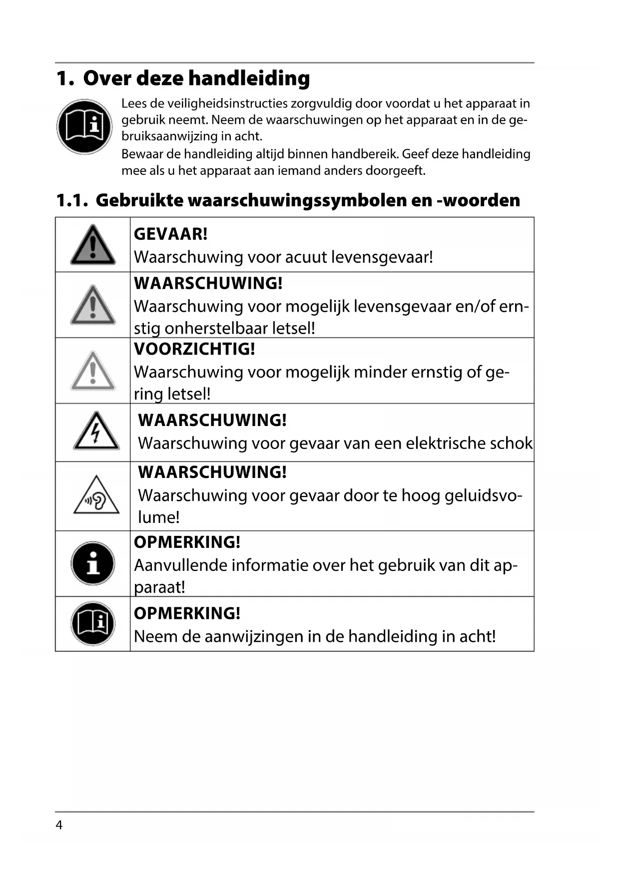 Lees de veiligheidsinstructies zorgvuldig door voordat u het apparaat in gebruik neemt. Neem de waarschuwingen op het apparaat en in de ge- bruiksaanwijzing in acht. Bewaar de handleiding altijd binnen handbereik. Geef deze handleiding mee als u het apparaat aan iemand anders doorgeeft. 1.1. Gebruikte waarschuwingssymbolen en -woorden GEVAAR! Waarschuwing voor acuut levensgevaar! WAARSCHUWING! Waarschuwing voor mogelijk levensgevaar en/of ern- stig onherstelbaar letsel! VOORZICHTIG! Waarschuwing voor mogelijk minder ernstig of ge- ring letsel! WAARSCHUWING! Waarschuwing voor gevaar van een elektrische schok WAARSCHUWING! Waarschuwing voor gevaar door te hoog geluidsvo- lume! OPMERKING! Aanvullende informatie over het gebruik van dit ap- paraat! OPMERKING! Neem de aanwijzingen in de handleiding in acht!5
