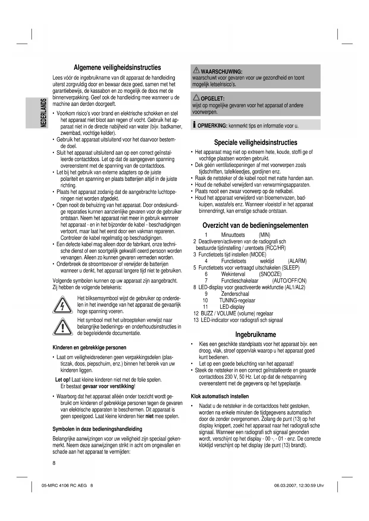 - Nadat u de netsteker in de contactdoos hebt gestoken, worden na enkele minuten de tijdgegevens automatisch door de zender overgenomen. Zolang de punt (13) op het display knippert, zoekt het apparaat naar het radiografi sche signaal. Wanneer een radiografi sch signaal gevonden wordt, verschijnt op het display - 00 -, - 01 - enz. De correcte kloktijd verschijnt op het display (de punt (13) brandt). 05-MRC 4106 RC AEG 8 06.03.2007, 12:30:59 Uhr9 NEDERLANDS NEDERLANDS