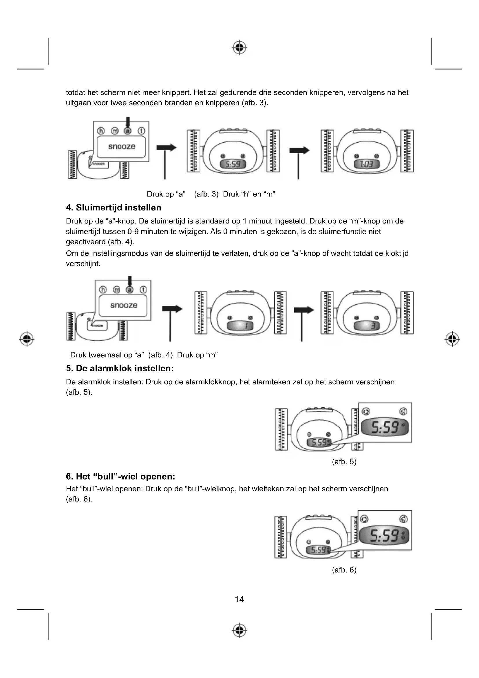 Druk op de "a"-knop. De sluimertijd is standaard op 1 minuut ingesteld. Druk op de "m"-knop om de sluimertijd tussen 0-9 minuten te wijzigen. Als 0 minuten is gekozen, is de sluimerfunctie niet geactiveerd (afb. 4).