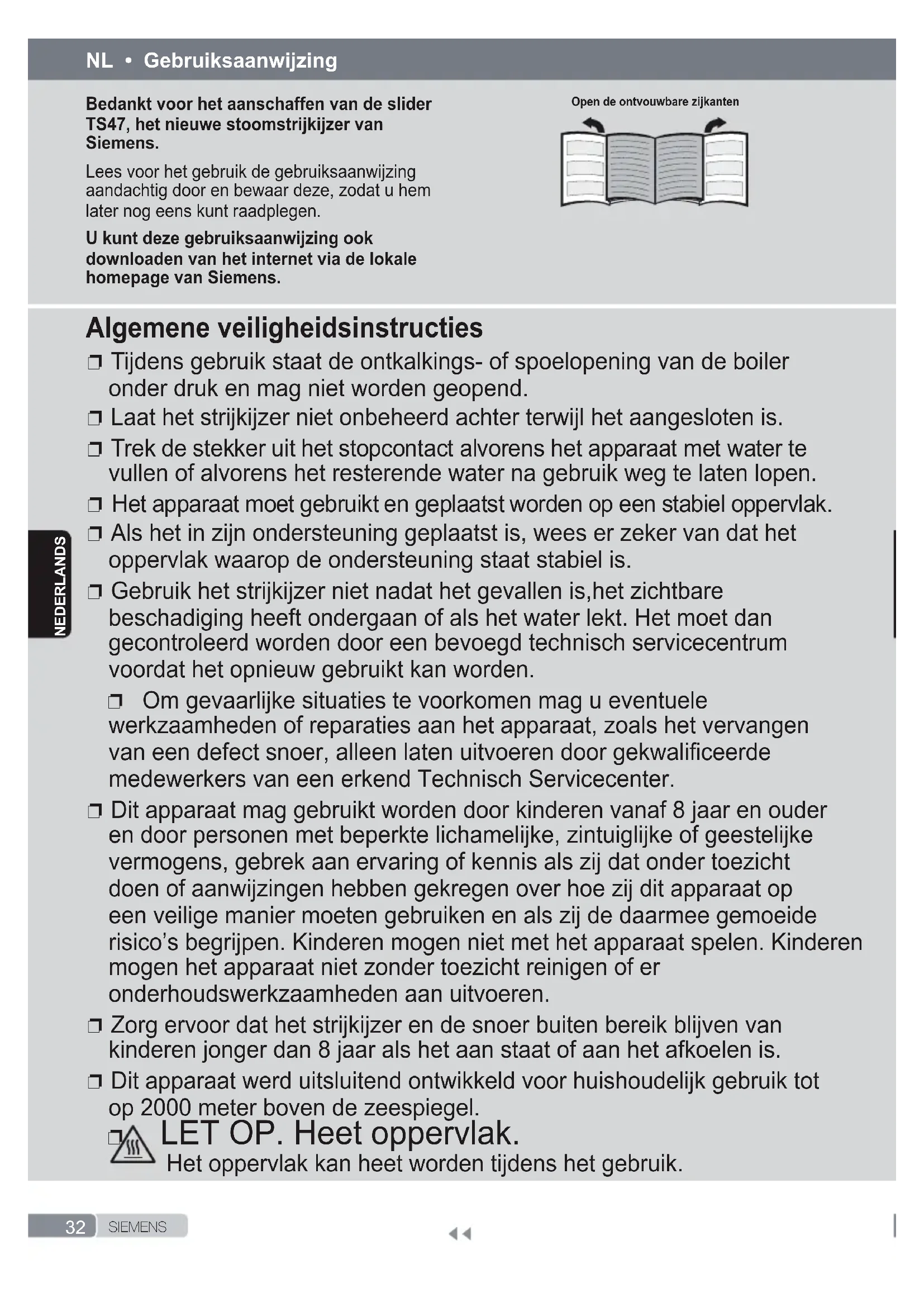 fer cessera d’émettre de la vapeur. Si les indications ci-dessus ne permettent pas de résoudre le problème, prenez contact avec votre service technique agréé.32 S I E M E N Snederlands Algemene veiligheidsinstructies ❐ Tijdens gebruik staat de ontkalkings- of spoelopening van de boiler onder druk en mag niet worden geopend. ❐ Laat het strijkijzer niet onbeheerd achter terwijl het aangesloten is. ❐ Trek de stekker uit het stopcontact alvorens het apparaat met water te vullen of alvorens het resterende water na gebruik weg te laten lopen. ❐ Het apparaat moet gebruikt en geplaatst worden op een stabiel oppervlak. ❐ Als het in zijn ondersteuning geplaatst is, wees er zeker van dat het oppervlak waarop de ondersteuning staat stabiel is. ❐ Gebruik het strijkijzer niet nadat het gevallen is,het zichtbare beschadiging heeft ondergaan of als het water lekt. Het moet dan gecontroleerd worden door een bevoegd technisch servicecentrum voordat het opnieuw gebruikt kan worden. ❐ Om gevaarlijke situaties te voorkomen mag u eventuele werkzaamheden of reparaties aan het apparaat, zoals het vervangen van een defect snoer, alleen laten uitvoeren door gekwaliceerde medewerkers van een erkend Technisch Servicecenter. ❐ Dit apparaat mag gebruikt worden door kinderen vanaf 8 jaar en ouder en door personen met beperkte lichamelijke, zintuiglijke of geestelijke vermogens, gebrek aan ervaring of kennis als zij dat onder toezicht doen of aanwijzingen hebben gekregen over hoe zij dit apparaat op een veilige manier moeten gebruiken en als zij de daarmee gemoeide risico’s begrijpen. Kinderen mogen niet met het apparaat spelen. Kinderen mogen het apparaat niet zonder toezicht reinigen of er onderhoudswerkzaamheden aan uitvoeren. ❐ Zorg ervoor dat het strijkijzer en de snoer buiten bereik blijven van kinderen jonger dan 8 jaar als het aan staat of aan het afkoelen is. ❐ Dit apparaat werd uitsluitend ontwikkeld voor huishoudelijk gebruik tot op 2000 meter boven de zeespiegel. ❐ LET OP. Heet oppervlak. Het oppervlak kan heet worden tijdens het gebruik. Bedankt voor het aanschaffen van de slider TS47, het nieuwe stoomstrijkijzer van Siemens. Lees voor het gebruik de gebruiksaanwijzing aandachtig door en bewaar deze, zodat u hem later nog eens kunt raadplegen. U kunt deze gebruiksaanwijzing ook downloaden van het internet via de lokale homepage van Siemens. Open de ontvouwbare zijkanten NL • Gebruiksaanwijzing33 S I E M E N S