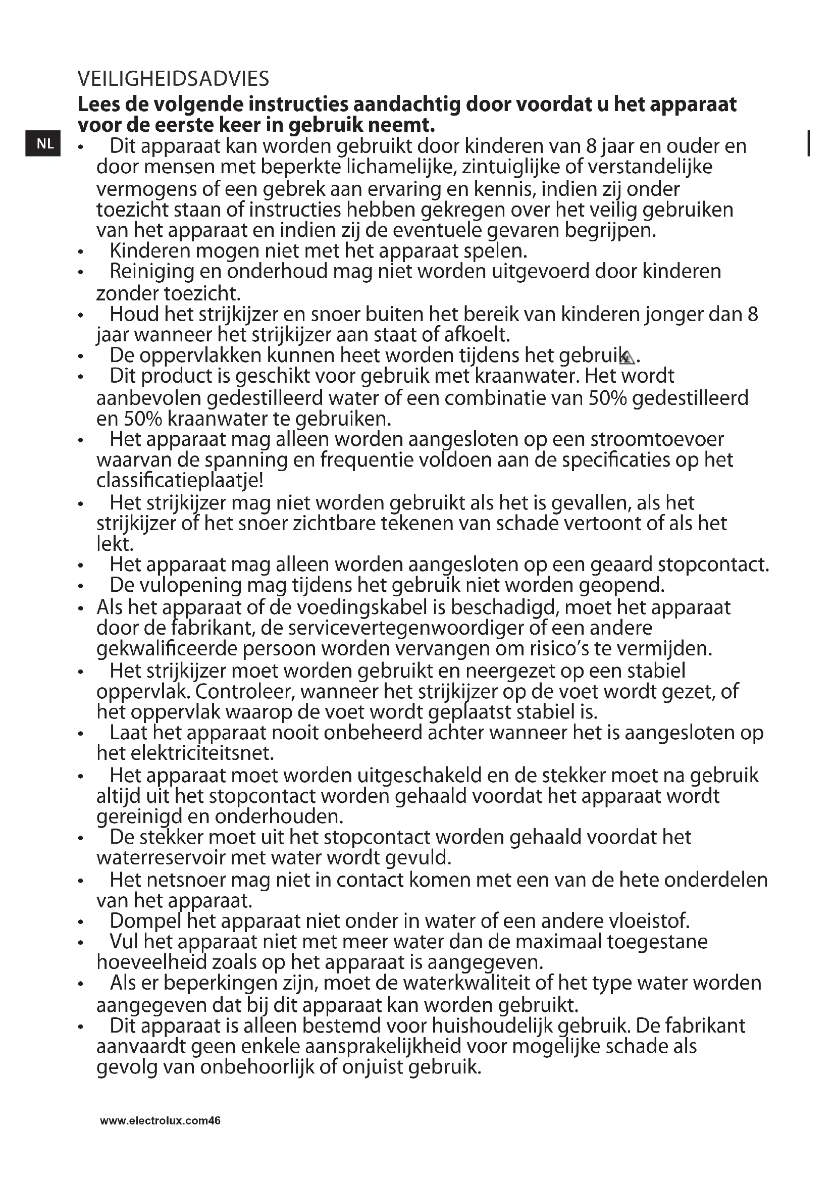 Sproeifunctie werkt niet. Onvoldoende water in het reservoir. Vulhetwaterreservoir(zie“Heteerste gebruik”,nr2). Stoom- en verticale stoomfunctie werken niet. Stoomfunctieiszeervaakgebruikt binnen een korte periode. Leghetstrijkijzerhorizontaalneeren wacht even voordat u de stoomfunctie opnieuw gebruikt. Strijkijzerwordtnietwarmgenoeg. Stel de juiste temperatuur in voor strijkenmetstoom(tot ). Zet het strijkijzerverticaalneerenwacht tot het temperatuurindicatielampje uitgaat. Er komen bruine strepen uit de zoolplaattijdenshetstrijkenendeze maken vlekken op het wasgoed. U heeft hard water gebruikt waardoor erkalkafzettingenzijnontstaaninhet waterreservoir. Gebruikdezelfreinigingsfunctieéénof meerdere keren. U hebt chemische antikalkmiddelen gebruikt. Gebruik geen antikalkmiddelen. Erzittenstofvezelsindegaatjesvande zoolplaatendieverbranden. Gebruikdezelfreinigingsfunctieéén ofmeerderekeren.Maakdezoolplaat schoonmeteenzachtvochtigdoek. Destoenzijnmogelijknietgoed gespoeld of de kleding is nieuw en is niet gewassen voor het strijken. Spoel het wasgoed nogmaals grondig. VERWIJDERING Recycle de materialen met het symbool . Gooideverpakkingineengeschikteverzamelcontainer om het te recyclen. Help om het milieu en de volksgezondheidtebeschermenenrecyclehetafvalvan elektrische en elektronische apparaten. Gooi apparaten gemarkeerd met het symbool niet weg met het huishoudelijk afval. Breng het product naar het milieustation bij u in de buurt of neem contact op met de gemeente. www.electrolux.com48No SIKKERHETSRåD Les følgende anvisninger nøye før du bruker maskinen for første gang.