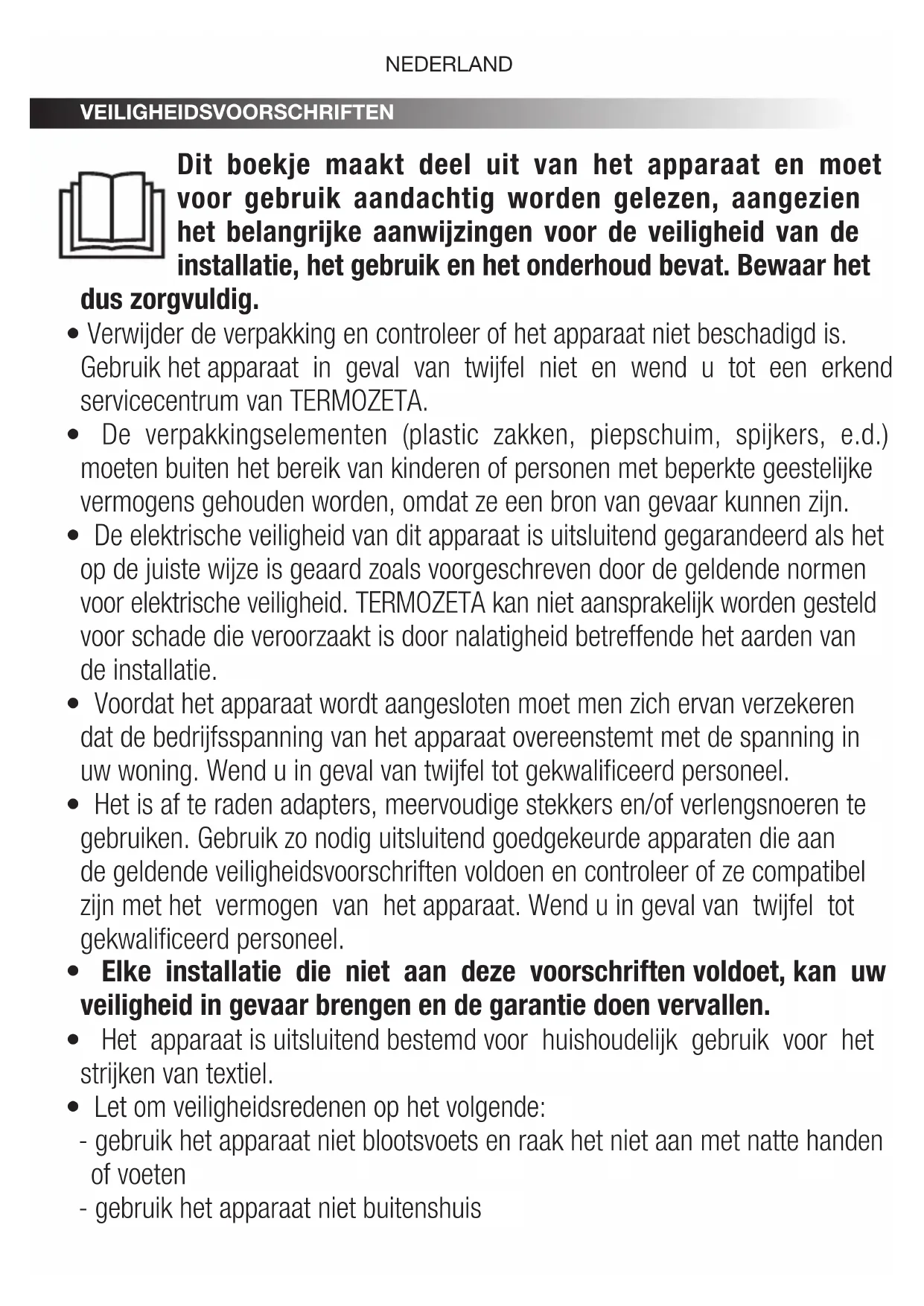 - Het netsnoer van het apparaat mag niet door de gebruiker worden vervangen. Wend u zo nodig tot een erkend servicecentrum van TERMOZETA of tot gekwaliceerd personeel.