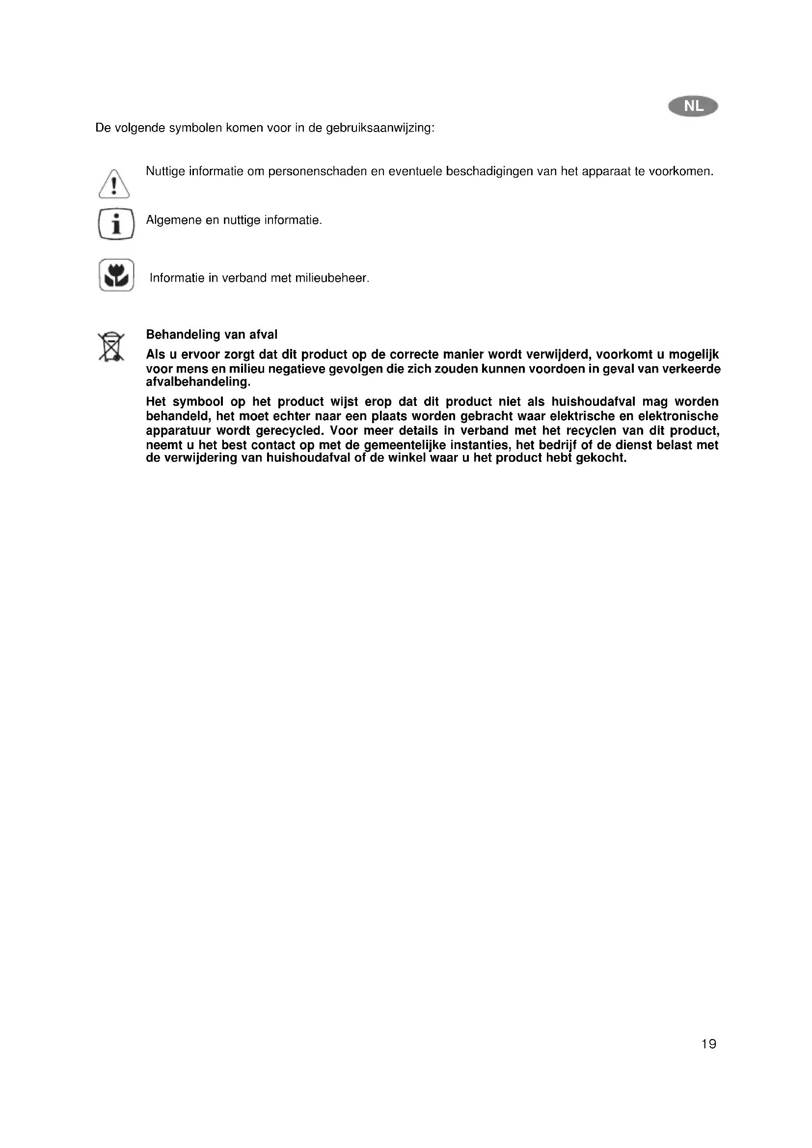 Trek de stekker nooit aan het snoer en trek het apparaat zeker niet aan het snoer. De vervanging van het aansluitsnoer mag alleen door een erkend installateur worden uitgevoerd. Zorg ervoor dat het achterste deel van het apparaat het snoer niet drukt of beschadigt. Rond om het apparaat moet voldoende luchtcirculatie zijn. Elektrische reparaties in verband met de installatie van dit apparaat mogen alleen door een erkend installateur worden uitgevoerd Let op! Het apparaat moet worden aangesloten aan een stopcontact met randaarde In gebruik nemen Vóór in gebruik nemen maak het apparaat binnen schoon. Zie "Reiniging en onderhoud". Sluit het apparaat aan. Druk op knop (A) om het apparaat in te schakelen. De display licht op. Het symbool ( ) op het display licht op, en de alarmtoon begint om te fluiten, omdat de temperatuur binnen de vrieskast te hoog is voor de levensmiddelen. Druk op knop (E) om de alarmtoon uit te schakelen. Het symbool ( ) wordt normaal gezien binnen enkele uren inactief. Leg de levensmiddelen naar de vrieskast alleen als het symbool ( ) al inactief is. De temperatuur binnen het apparaat is ingesteld naar -18°C omdat dit is de optimale temperatuur in de Eco Mode ( ). Hoofdschakelaar Het apparaat inschakelen Druk op de knop (A) om het apparaat in te schakelen. De display licht op. Het apparaat uitschakelen Druk op de knop (A) langer dan 1 seconde, tot de countdown "3-2-1" begint, en tot u de reeks van piepen hoort. De display wordt inactief. Let op! Zet geen voorwerpen naar het bedieningspaneel omdat het de vrieskast toevallig kan uitschakelen. Dagelijks gebruik Temperatuurregeling De temperatuur kan tussen -15°C en -24°C worden geregeld. We raden u aan om de vrieskast naar -18°C te stellen, dit kan zowel een optimaal invriezen als de optimale opslag van de gevroren levensmiddelen garanderen. Druk herhaald de knop (B), tot de gewenste temperatuur op de display verschijnt. De waarde op de display flikkert en toont de ingestelde temperatuur. Druk de knop (E) om de gewenste temperatuur te bevestigen. U hoort een fluittoon. De temperatuur op de display flikkert niet meer en de display toont de temperatuur binnen de vrieskast. De gewenste temperatuur wordt binnen enkele uren ingesteld. Binnen deze periode is het normaal dat de vermelde temperatuur afwijkt van de ingestelde temperatuur. Let op! De afwijking tussen de aangetoonde en de ingestelde temperatuur is normaal, in het bijzonder als: De instelling van de temperatuur onlangs werd gewijzigd. Het deksel langer geopend was. U warme levensmiddelen naar de vrieskast hebt gelegd. De Super Freeze functie is ingeschakeld. Super Freeze functie Indien u meerd dan 3-4 kg verse levensmiddelen wilt invriezen, dan moet het vriesapparaat worden vooraf afgekoeld. Drukt u de (D) knop herhaald, ten minste 24 vóór u de verse levensmiddelen inlegt, tot het passende symbool ( ) op de display verschijnt. Drukt u op de (E) knop binnen enkele seconden, om de Super Freeze functie te bevestigen.Het ( ) symbool blinkt niet meer, u hoort een alarmsignaal en de animatie op de display wordt sneller. Leg de levensmiddelen naar de vrieskast. Deze functie wordt na 52 uren automatisch uitgeschakeld, en de vrieskast keert terug naar de normale temperatuur. Deze functie kunt u altijd uitschakelen, indien u de (D) knop drukt, tot het passende symbool ( ) op de display begint om te flikkeren, dan bevestig het uitschakelen van de functie met de (E) knop. Drinks Chill functie Deze functie kan als alarmfunctie worden gebruikt, als u flessen naar het apparaat legt, omdat deze kunnen uiteenbarsten als u ze in het apparaat laat. Druk opnieuw naar de (D) knop, tot het passende symbool ( ) op de display begint te flikkeren. Druk op de (E) knop binnen enkele seconden, om de Drink Chill functie te bevestigen. Het ( ) symbool blinkt niet meer, u hoort een alarmsignaal. Druk herhaald of voortdurend de (B) knop om de minuten in te stellen (vanaf 1 t/m 90 minuten). Leg de dranken naar het apparaat. Na afloop van de ingestelde tijd hoort u een alarmsignaal en het ( ) symbool en de flikkerende tijd verschijnen op de display. Druk op de (E) knop om de alarmfunctie uit te schakelen. Neem de dranken uit de vrieskast. Deze functie kunt u altijd uitschakelen, indien u de (D) knop drukt, tot het passende symbool ( ) op de display begint om te flikkeren, dan bevestig het uitschakelen van de functie met de (E) knop. Economische functie (Eco Mode) functie Met deze functie kan de optimale temperatuur van het apparaat worden ingesteld (- 18°C), zodat de behoorlijke conservering van de ingevroren levensmiddelen naast een laag energieverbruik kan worden gegarandeerd. Druk opnieuw naar de (D) knop, tot het passende symbool ( ) op de display begint te flikkeren. Druk op de (E) knop binnen enkele seconden, om de Eco Mode functie te bevestigen. Het ( ) symbool flikkert niet meer en er is een alarmsignaal hoorbaar. Deze functie kan altijd worden uitgeschakeld, indien u de temperatuur met de (B) knop wijzigt, en de keuze tenslotte met de (E) knop goedkeurt. NL22 Child Lock functie Met deze functie kan u verhinderen dat de kinderen met de knoppen op het bedieningspaneel spelen. In dit geval gebeurt bij het drukken van de knoppen niets. Druk opnieuw naar de (D) knop, tot het passende symbool ( ) op de display begint te flikkeren. Drukt u op de (E) knop binnen enkele seconden, om de Child Lock functie te bevestigen. Het ( ) symbool flikkert niet meer en er is een alarmsignaal hoorbaar. De knoppen van het bedieningspaneel zijn gesloten. Deze functie kunt u altijd uitschakelen, indien u de (D) knop drukt, tot het passende symbool ( ) op de display begint om te flikkeren, dan bevestig het uitschakelen van de functie met de (E) knop. Alarmsignaal Indien de temperatuur van de vrieskast te hoog is, dan wordt een alarmsignaal hoorbaar, en het ( ) symbool en de temperatuur beginnen flikkeren op de display. Als de normale omstandigheden weer terugkeren, flikkert alleen de temperatuur van de vrieska