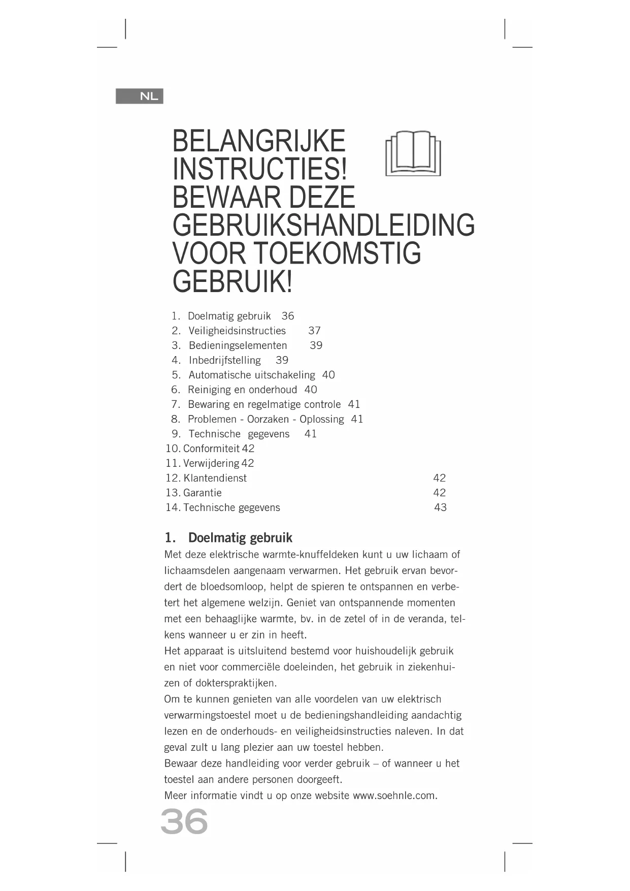 Laat de deken nicht chemisch reinigen. - De warmtedeken mag Niet in de droogmachine worden gedroogd.