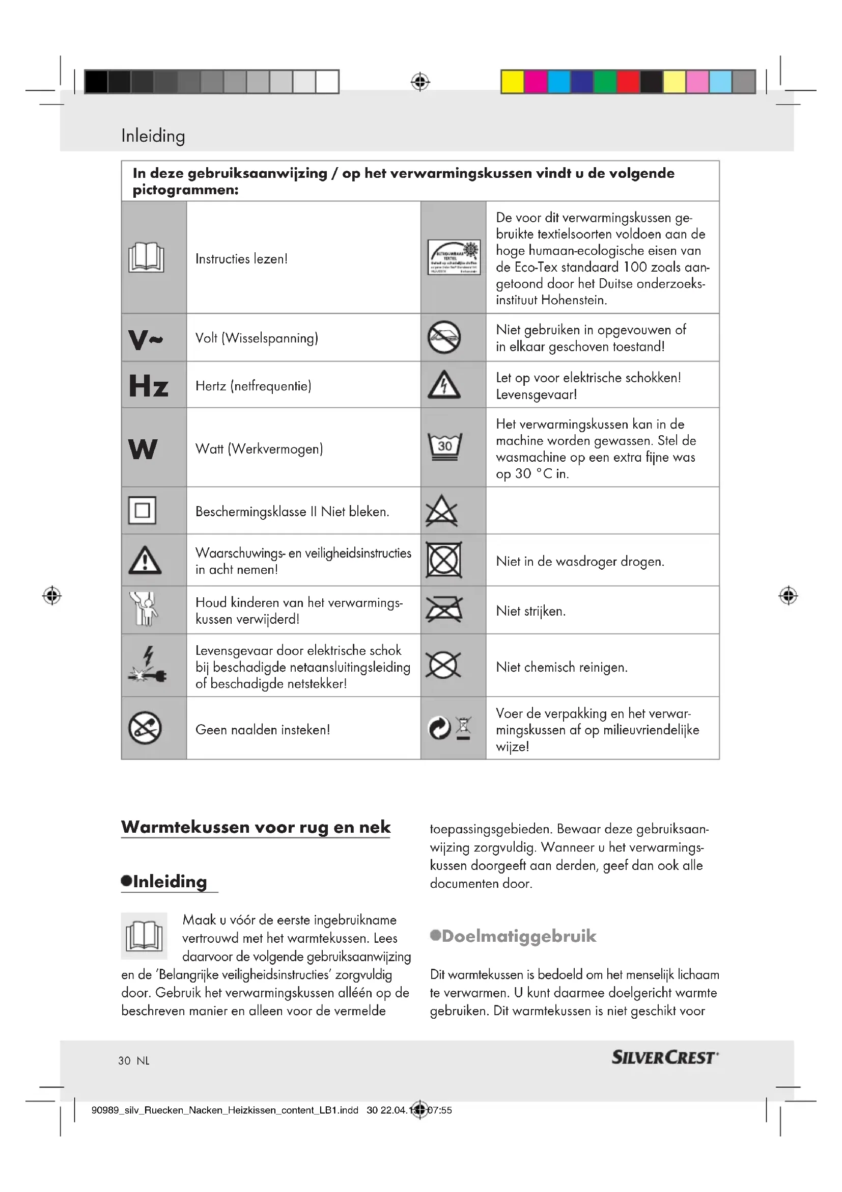 Watt (Werkvermogen) Het verwarmingskussen kan in de machine worden gewassen. Stel de wasmachine op een extra fijne was op 30 °C in. Beschermingsklasse II Niet bleken. Waarschuwings- en veiligheidsinstructies in acht nemen! Niet in de wasdroger drogen. Houd kinderen van het verwarmings- kussen verwijderd! Niet strijken. Levensgevaar door elektrische schok bij beschadigde netaansluitingsleiding of beschadigde netstekker! Niet chemisch reinigen. Geen naalden insteken! Voer de verpakking en het verwar- mingskussen af op milieuvriendelijke wijze! Inleiding 90989_silv_Ruecken_Nacken_Heizkissen_content_LB1.indd 30 22.04.13 07:5531 NL gebruik in ziekenhuizen of voor commercieel gebruik. Het is niet toegestaan om dieren, zuigelingen, kleine kinderen, warmteongevoelige of hulpeloze personen met het kussen te verwarmen. Een ander gebruik dan tevoren beschreven of een verande- ring aan het verwarmingskussen is niet toegestaan en kan tot letsel en / of beschadigingen aan het verwarmingskussen leiden. De fabrikant is niet aan- sprakelijk voor schade die terug te voeren is op ondoelmatig gebruik. Onderdelenbeschrijving