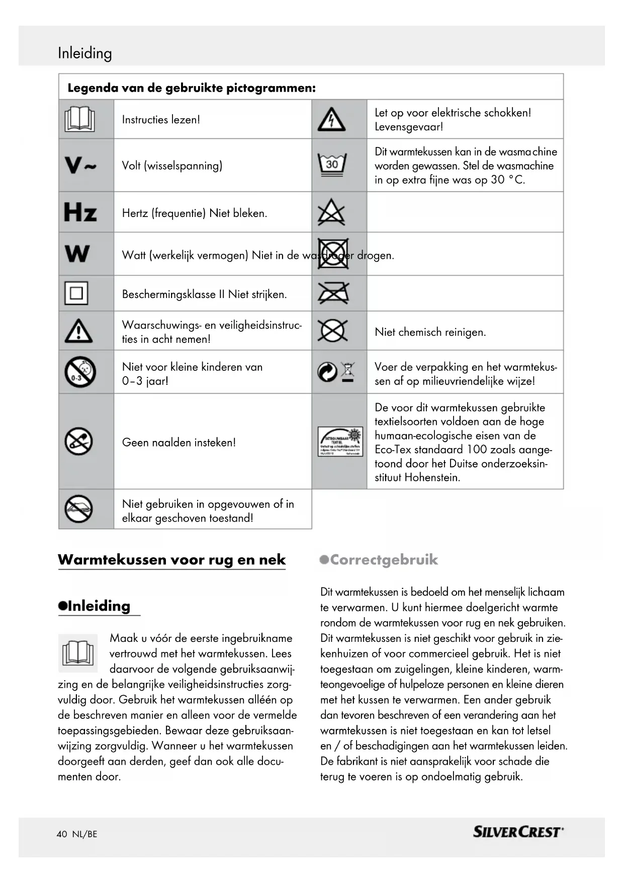 Steekkoppeling (zie afb. B) Omvang van de levering Controleer de levering direct na het uitpakken op volledigheid en optimale staat van het warmtekussen. 1 warmtekussen voor rug en nek 1 bediening / koppeling met netstekker 1 gebruiksaanwijzing Technische gegevens Model: SRNH 100 C2 Type: P10F Spanningsverzorging: 220–240 V / 50–60 Hz Opgenomen vermogen: 100 W Afmetingen: ca. 65 x 38 cm Beschermingsklasse: II / Elektrische veldsterkte: max. 5000 V / m Magnetische veldsterkte: max. 80 A / m Magnetische fluxdichtheid: max. 0,1 millitesla Materiaal: Bovenkant / onderkant: 100 % polyester Fabrikant: MGG Elektro GmbH Steinstraße 27 D-40210 Düsseldorf, Duitsland Belangrijke veiligheidsinstructies Het negeren van de onderstaande in- structies kan persoonlijk letsel of materiële schaden (elektrische schok, brandwonden, brand) veroorzaken. De volgende veiligheids- en gevaren- instructies zijn niet alleen voor uw eigen veiligheid c.q. de veiligheid van derden, maar ook ter bescher- ming van het warmtekussen. Neem daarom deze veiligheidsinstructies in acht en geef de gebruiksaanwij- zing door wanneer u het warmtekus- sen doorgeeft. GEVAAR VOOR BRANDWONDEN! Dit warmtekussen mag niet door personen worden gebruikt, die ongevoelig zijn voor hitte en door andere hulpbehoevende person en, die niet op een oververhitting kunnen reageren (bijv. diabetici, personen met huidveranderingen die door een ziekte worden ver- oorzaakt of die littekens hebben BELANGRIJKE INSTRUCTIES –