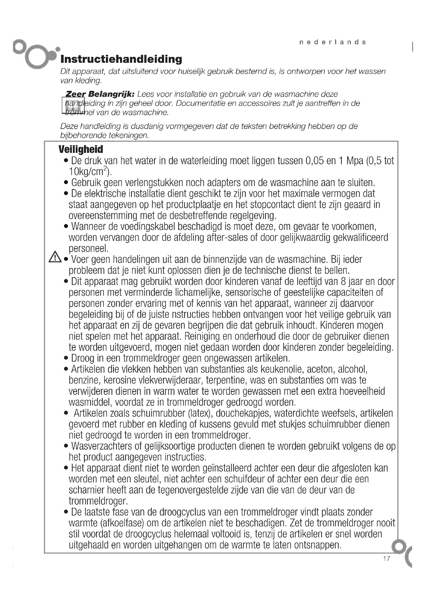 max.17 nederlands Dit apparaat, dat uitsluitend voor huiselijk gebruik bestemd is, is ontworpen voor het wassen van kleding. Zeer Belangrijk: Lees voor installatie en gebruik van de wasmachine deze handleiding in zijn geheel door. Documentatie en accessoires zult je aantreffen in de trommel van de wasmachine. Deze handleiding is dusdanig vormgegeven dat de teksten betrekking hebben op de bijbehorende tekeningen. Instructiehandleiding