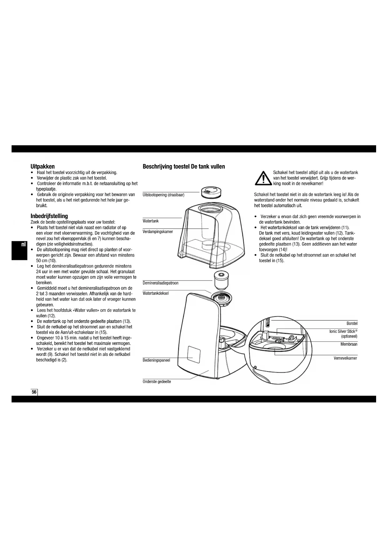 Beschrijving toestel De tank vullen Schakelhettoestelaltijduitalsudewatertank vanhettoestelverwijdert.Grijptijdensdewer- king nooit in de nevelkamer! Schakel het toestel niet in als de watertank leeg is! Als de waterstand onder het normale niveau gedaald is, schakelt hettoestelautomatischuit.