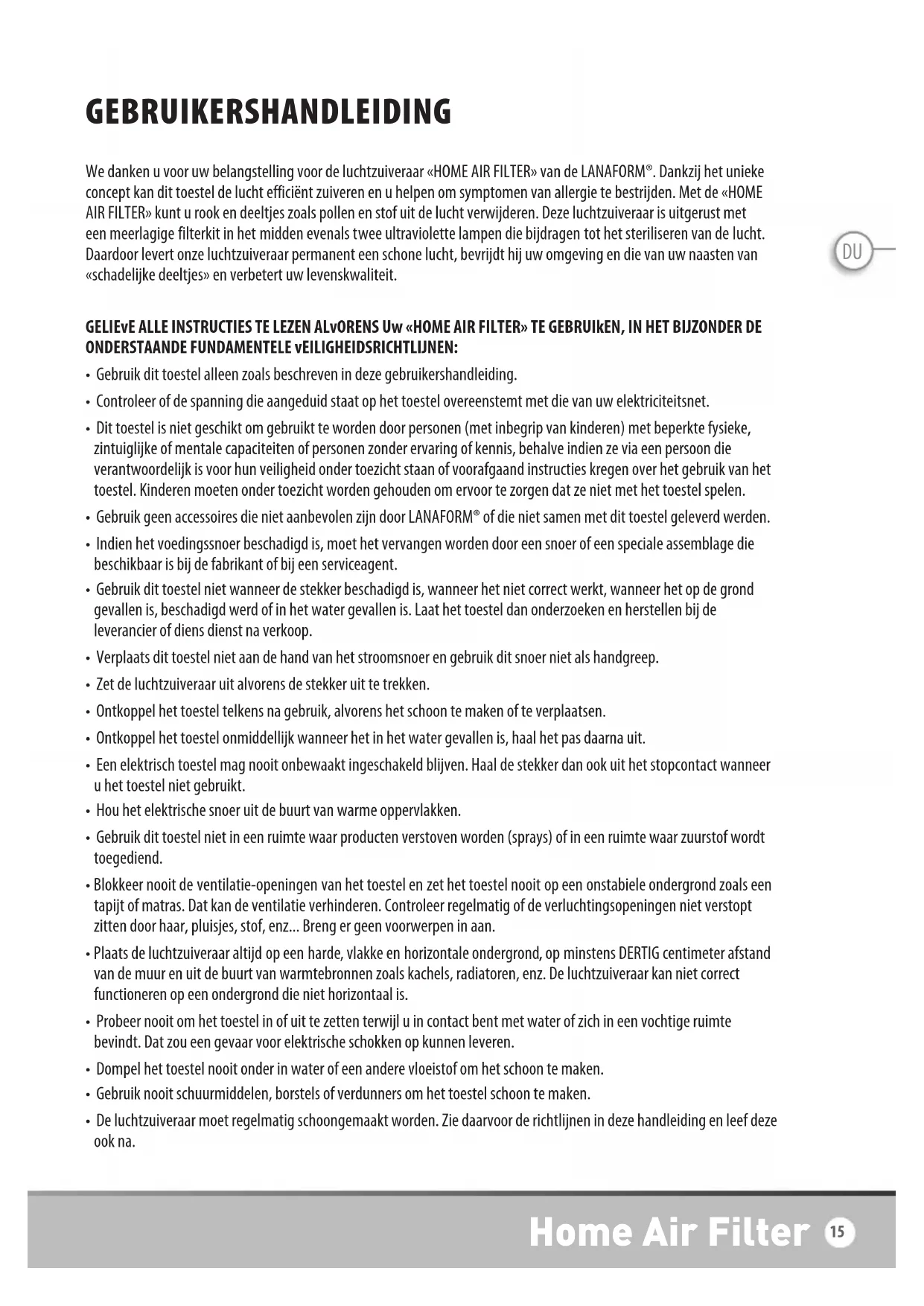 - De luchtzuiveraar moet regelmatig schoongemaakt worden. Zie daarvoor de richtlijnen in deze handleiding en leef deze ook na. Home Air Filter 15DU