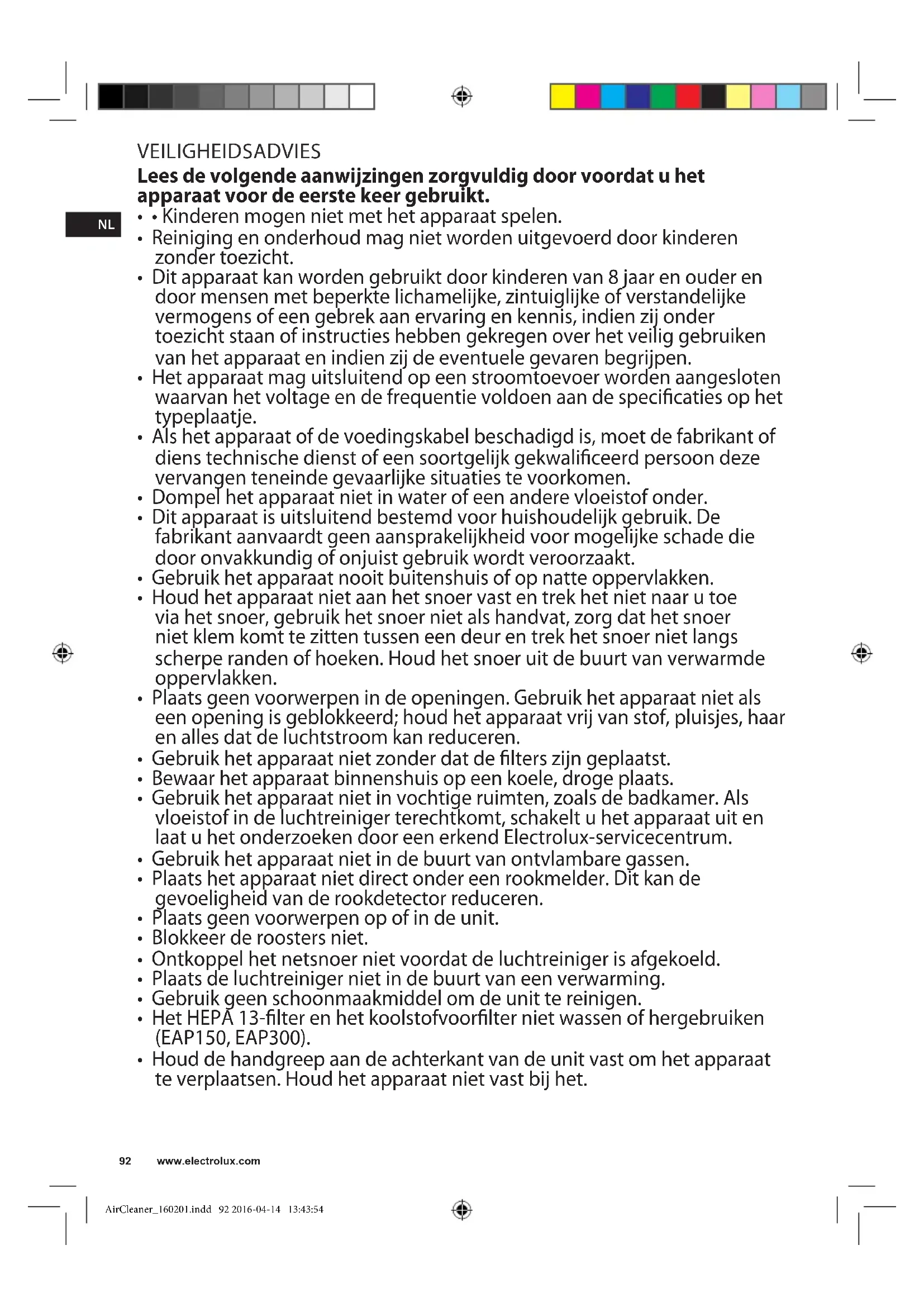 AirCleaner_160201.indd 91 2016-04-14 13:43:54NL VEILIGHEIDSADVIES Lees de volgende aanwijzingen zorgvuldig door voordat u het apparaat voor de eerste keer gebruikt.