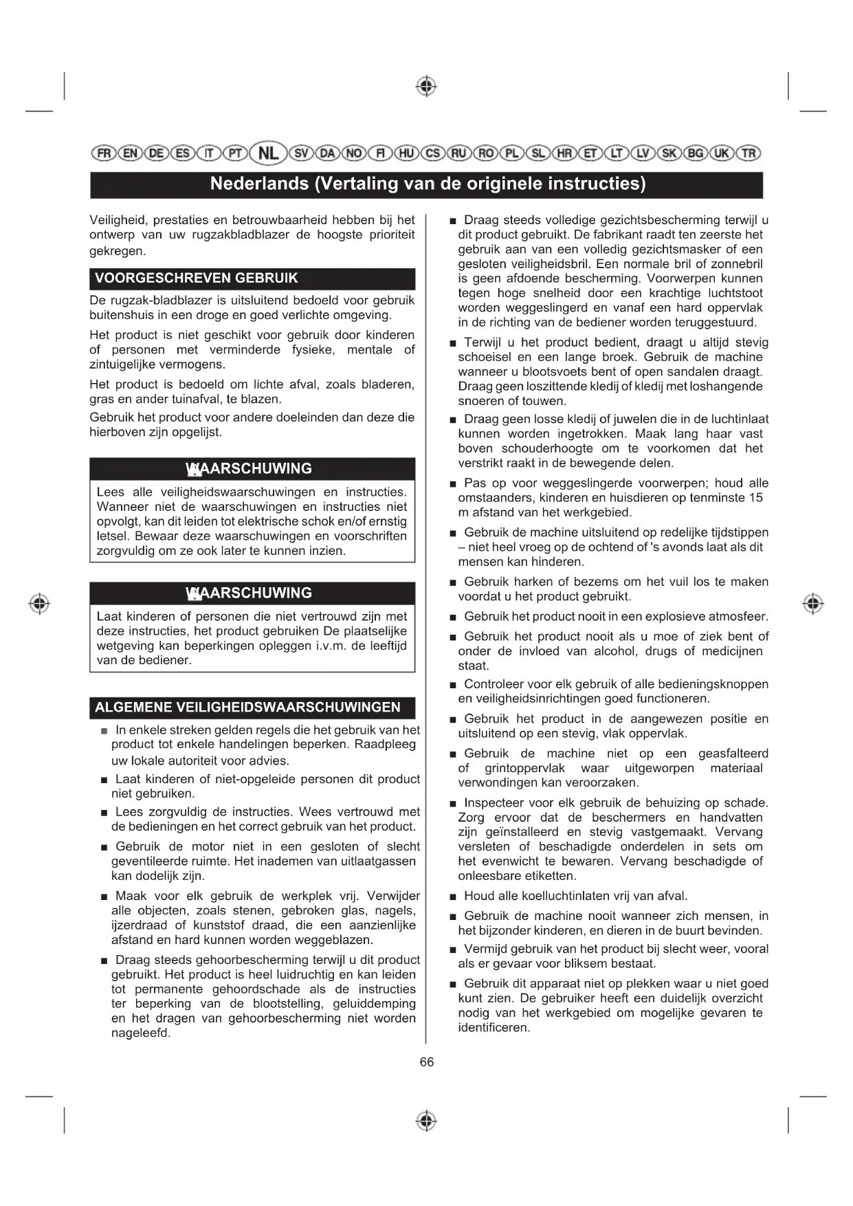 NOTAS: ■ A manutenção deve ser realizada de forma mais frequente quando se utilizar o aparelho numa zona com pó. ■ Mesmo quando o produto tiver ultrapassado os valores máximos especificados na tabela, continue a fazer os ciclos de manutenção aos intervalos de tempo ou às horas de funcionamento aqui indicadas.66 Nederlands (Vertaling van de originele instructies) Veiligheid, prestaties en betrouwbaarheid hebben bij het ontwerp van uw rugzakbladblazer de hoogste prioriteit gekregen. VOORGESCHREVEN GEBRUIK De rugzak-bladblazer is uitsluitend bedoeld voor gebruik buitenshuis in een droge en goed verlichte omgeving. Het product is niet geschikt voor gebruik door kinderen of personen met verminderde fysieke, mentale of zintuigelijke vermogens. Het product is bedoeld om lichte afval, zoals bladeren, gras en ander tuinafval, te blazen. Gebruik het product voor andere doeleinden dan deze die hierboven zijn opgelijst. WAARSCHUWING Lees alle veiligheidswaarschuwingen en instructies. Wanneer niet de waarschuwingen en instructies niet opvolgt, kan dit leiden tot elektrische schok en/of ernstig letsel. Bewaar deze waarschuwingen en voorschriften zorgvuldig om ze ook later te kunnen inzien. WAARSCHUWING Laat kinderen of personen die niet vertrouwd zijn met deze instructies, het product gebruiken De plaatselijke wetgeving kan beperkingen opleggen i.v.m. de leeftijd van de bediener. ALGEMENE VEILIGHEIDSWAARSCHUWINGEN ■ In enkele streken gelden regels die het gebruik van het product tot enkele handelingen beperken. Raadpleeg uw lokale autoriteit voor advies. ■ Laat kinderen of niet-opgeleide personen dit product niet gebruiken. ■ Lees zorgvuldig de instructies. Wees vertrouwd met de bedieningen en het correct gebruik van het product. ■ Gebruik de motor niet in een gesloten of slecht geventileerde ruimte. Het inademen van uitlaatgassen kan dodelijk zijn. ■ Maak voor elk gebruik de werkplek vrij. Verwijder alle objecten, zoals stenen, gebroken glas, nagels, ijzerdraad of kunststof draad, die een aanzienlijke afstand en hard kunnen worden weggeblazen. ■ Draag steeds gehoorbescherming terwijl u dit product gebruikt. Het product is heel luidruchtig en kan leiden tot permanente gehoordschade als de instructies ter beperking van de blootstelling, geluiddemping en het dragen van gehoorbescherming niet worden nageleefd. ■ Draag steeds volledige gezichtsbescherming terwijl u dit product gebruikt. De fabrikant raadt ten zeerste het gebruik aan van een volledig gezichtsmasker of een gesloten veiligheidsbril. Een normale bril of zonnebril is geen afdoende bescherming. Voorwerpen kunnen tegen hoge snelheid door een krachtige luchtstoot worden weggeslingerd en vanaf een hard oppervlak in de richting van de bediener worden teruggestuurd. ■ Terwijl u het product bedient, draagt u altijd stevig schoeisel en een lange broek. Gebruik de machine wanneer u blootsvoets bent of open sandalen draagt. Draag geen loszittende kledij of kledij met loshangende snoeren of touwen. ■ Draag geen losse kledij of juwelen die in de luchtinlaat kunnen worden ingetrokken. Maak lang haar vast boven schouderhoogte om te voorkomen dat het verstrikt raakt in de bewegende delen. ■ Pas op voor weggeslingerde voorwerpen; houd alle omstaanders, kinderen en huisdieren op tenminste 15 m afstand van het werkgebied. ■ Gebruik de machine uitsluitend op redelijke tijdstippen – niet heel vroeg op de ochtend of 's avonds laat als dit mensen kan hinderen. ■ Gebruik harken of bezems om het vuil los te maken voordat u het product gebruikt. ■ Gebruik het product nooit in een explosieve atmosfeer. ■ Gebruik het product nooit als u moe of ziek bent of onder de invloed van alcohol, drugs of medicijnen staat. ■ Controleer voor elk gebruik of alle bedieningsknoppen en veiligheidsinrichtingen goed functioneren. ■ Gebruik het product in de aangewezen positie en uitsluitend op een stevig, vlak oppervlak. ■ Gebruik de machine niet op een geasfalteerd of grintoppervlak waar uitgeworpen materiaal verwondingen kan veroorzaken. ■ Inspecteer voor elk gebruik de behuizing op schade. Zorg ervoor dat de beschermers en handvatten zijn geïnstalleerd en stevig vastgemaakt. Vervang versleten of beschadigde onderdelen in sets om het evenwicht te bewaren. Vervang beschadigde of onleesbare etiketten. ■ Houd alle koelluchtinlaten vrij van afval. ■ Gebruik de machine nooit wanneer zich mensen, in het bijzonder kinderen, en dieren in de buurt bevinden. ■ Vermijd gebruik van het product bij slecht weer, vooral als er gevaar voor bliksem bestaat. ■ Gebruik dit apparaat niet op plekken waar u niet goed kunt zien. De gebruiker heeft een duidelijk overzicht nodig van het werkgebied om mogelijke gevaren te identificeren.67 Nederlands (Vertaling van de originele instructies) ■ Het gebruik van gelijksoortige apparaten in de nabijheid verhoogt het risico van letsel en de mogelijkheid dat er andere mensen in uw werkgebied komen. ■ Zorg ervoor dat u altijd stevig vast staat op hellingen. Stap altijd, loop nooit. ■ Ga altijd stevig op uw benen staan en reik niet te ver weg met uw arm. Overrek u niet. Rek u niet uit, waardoor u uw evenwicht kunt verliezen. ■ Gebruik het product nooit met een defecte beschermer of schild of zonder veiligheidsvoorzieningen, bijvoorbeeld een afvalcollector. ■ Het apparaat op geen enkele wijze aanpassen of reserveonderdelen gebruiken die niet worden aanbevolen door de fabrikant. WAARSCHUWING Als u het product laat vallen, het een ernstige impact ondergaat of abnormaal begint te trillen, legt u het product onmiddellijk stil en controleert u het op schade of zoekt u naar de oorzaak van de trillingen. Enige schade moet direct worden gerepareerd of vervangen door een bevoegd onderhoudscentrum. ■ Raak de omgeving rond de geluiddemper of motor niet aan; deze onderdelen worden tijdens de werking warm. ■ Stop de motor en laat het product afkoelen alvorens u tankt. ■ Voor het tanken en het mengen van brandsto