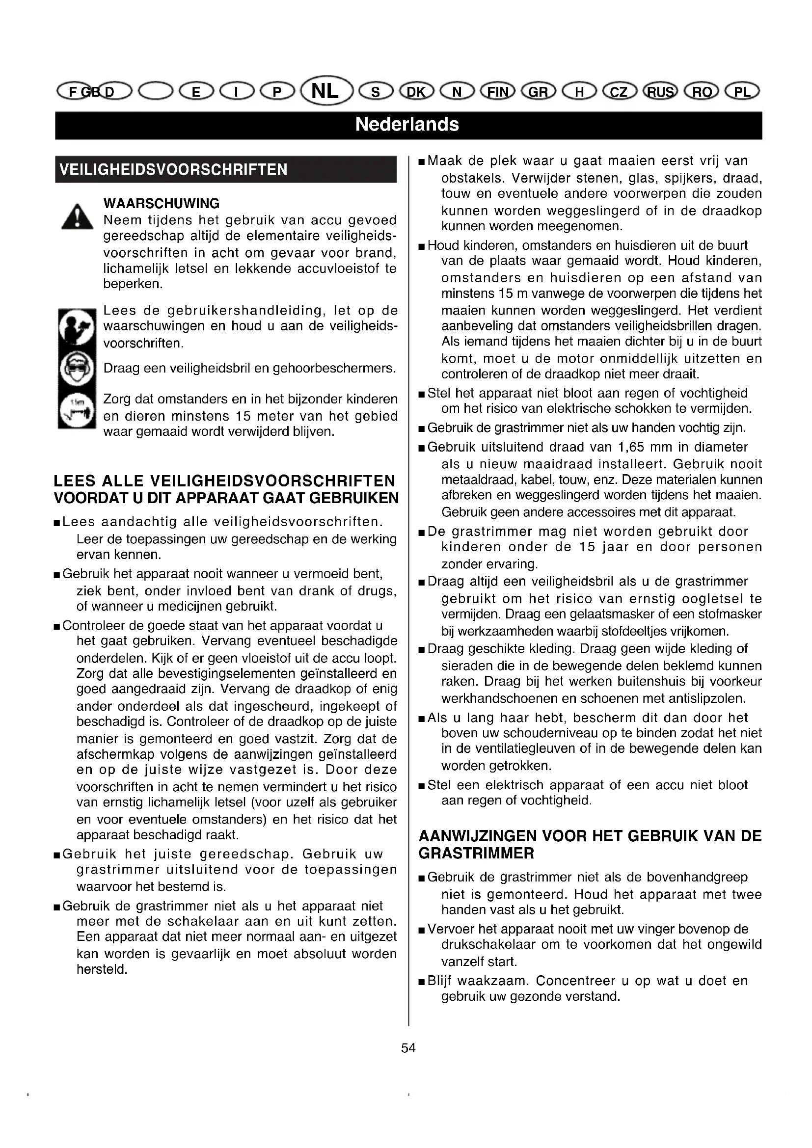 F GB D Portugues E I NL S DK N FIN GR H CZ RUS RO PL CLT-1423P / 1823 P manual 24/11/04 11:57 Page 53VEILIGHEIDSVOORSCHRIFTEN WAARSCHUWING Neem tijdens het gebruik van accu gevoed gereedschap altijd de elementaire veiligheids- voorschriften in acht om gevaar voor brand, lichamelijk letsel en lekkende accuvloeistof te beperken. Lees de gebruikershandleiding, let op de waarschuwingen en houd u aan de veiligheids- voorschriften. Draag een veiligheidsbril en gehoorbeschermers. Zorg dat omstanders en in het bijzonder kinderen en dieren minstens 15 meter van het gebied waar gemaaid wordt verwijderd blijven.