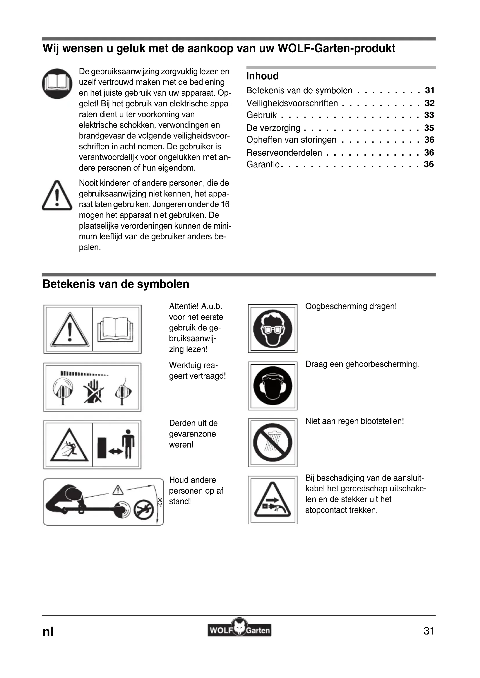 Wij wensen u geluk met de aankoop van uw WOLF-Garten-produkt Inhoud Betekenis van de symbolen