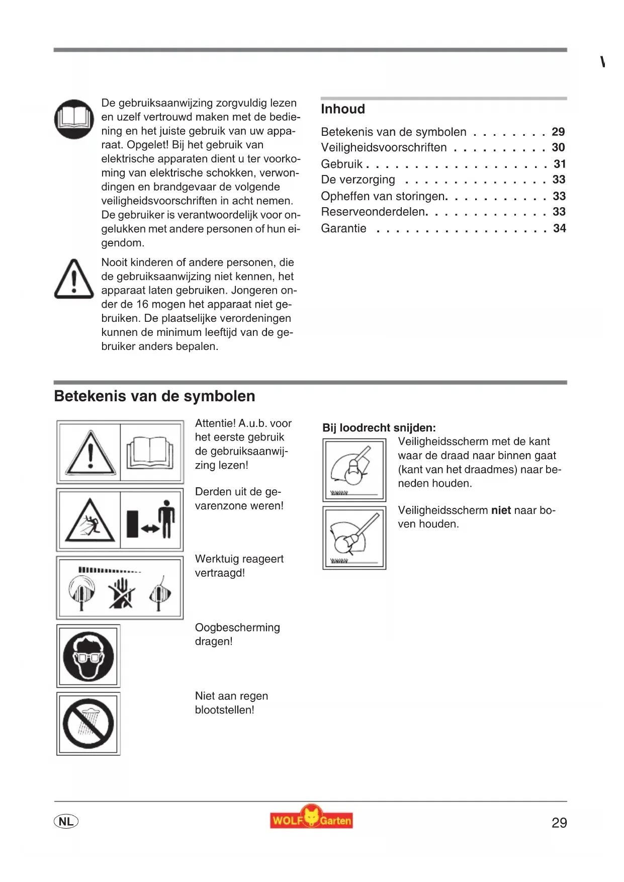 Wachten tot de motor stilstaat. - Het onderhoud en het reinigen van het apparaat mag alleen met een stilstaande motor gebeuren en indien het apparaat Nieteer op de elektriciteit is geschakeld. Let op, alleen origine WOLF draadcassettes gebruiken. Montage-aanwijzigingen opvolgen.