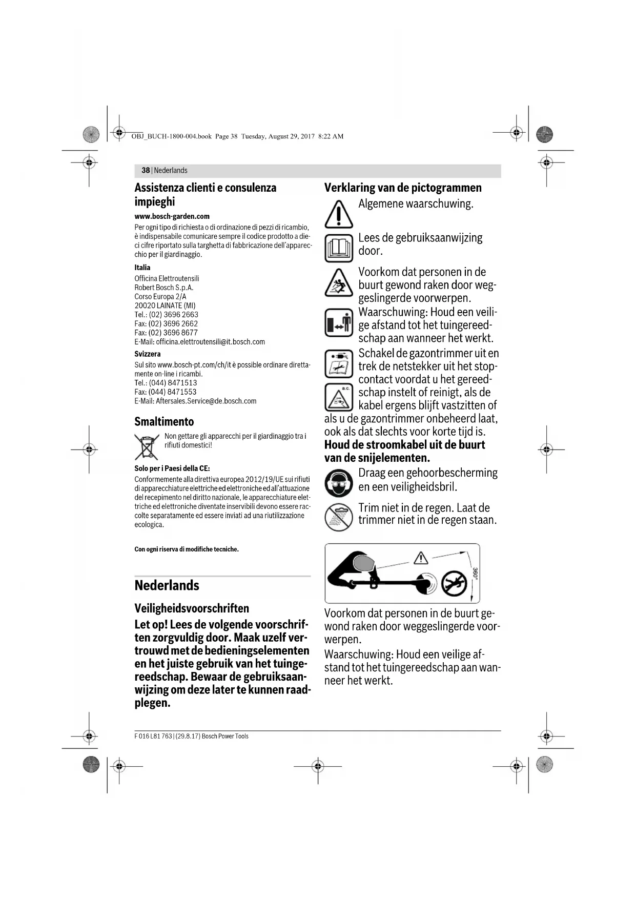 Scopo dell’operazione Figura Pagina Problema Possibili cause Rimedi Il tosaerba non funziona Tensione di rete assente Controllare ed inserire Presa elettrica difettosa Utilizzare un’altra presa Cavo di prolunga danneggiato Controllare il cavo e, se necessario, sostituirlo Il fusibile è scattato Sostituire il fusibile Il tosaerba funziona con interruzioni Cavo di prolunga danneggiato Controllare il cavo e, se necessario, sostituirlo Contattare il centro assistenza clienti Cablaggio interno dell’apparecchio per il giardinaggio difettoso Contattare il centro assistenza clienti Apparecchio per il giardinaggio sovraccarico Erba troppo alta Tagliare in diverse fasi L’apparecchio per il giardinaggio non taglia Elementi di taglio troppo corti/rotti Sostituire gli elementi di taglio Il filo da taglio non viene alimentato Bobina del filo vuota Sostituire la bobina del filo Filo da taglio aggrovigliato bella bobina Controllare la bobina e, se necessario, riavvolgere il filo di nuovo Il filo da taglio viene tirato indietro nella bobina Premendo il dispositivo di alimentazione il filo da taglio non viene alimentato Avvolgere di nuovo la bobina del filo (vedi figura 11) Il filo da taglio continua a rompersi Filo da taglio aggrovigliato bella bobina Controllare la bobina e, se necessario, riavvolgere il filo di nuovo Tosaerba non utilizzato correttamente Tagliare solo con la punta del filo da ta- glio; evitare di toccare pietre, pareti ed altri oggetti duri. Alimentare regolarmen- te il filo da taglio per utilizzare la completa larghezza di taglio. OBJ_BUCH-1800-004.book Page 37 Tuesday, August 29, 2017 8:22 AM38 | Nederlands F 016 L81 763 | (29.8.17) Bosch Power Tools Assistenza clienti e consulenza impieghi www.bosch-garden.com Per ogni tipo di richiesta o di ordinazione di pezzi di ricambio, è indispensabile comunicare sempre il codice prodotto a die- ci cifre riportato sulla targhetta di fabbricazione dell’apparec- chio per il giardinaggio. Italia Officina Elettroutensili Robert Bosch S.p.A. Corso Europa 2/A 20020 LAINATE (MI) Tel.: (02) 3696 2663 Fax: (02) 3696 2662 Fax: (02) 3696 8677 E-Mail: officina.elettroutensili@it.bosch.com Svizzera Sul sito www.bosch-pt.com/ch/it è possible ordinare diretta- mente on-line i ricambi. Tel.: (044) 8471513 Fax: (044) 8471553 E-Mail: Aftersales.Service@de.bosch.com Smaltimento Non gettare gli apparecchi per il giardinaggio tra i rifiuti domestici! Solo per i Paesi della CE: Conformemente alla direttiva europea 2012/19/UE sui rifiuti di apparecchiature elettriche ed elettroniche ed all’attuazione del recepimento nel diritto nazionale, le apparecchiature elet- triche ed elettroniche diventate inservibili devono essere rac- colte separatamente ed essere inviati ad una riutilizzazione ecologica. Con ogni riserva di modifiche tecniche. Nederlands Veiligheidsvoorschriften Let op! Lees de volgende voorschrif- ten zorgvuldig door. Maak uzelf ver- trouwd met de bedieningselementen en het juiste gebruik van het tuinge- reedschap. Bewaar de gebruiksaan- wijzing om deze later te kunnen raad- plegen. Verklaring van de pictogrammen Algemene waarschuwing. Lees de gebruiksaanwijzing door. Voorkom dat personen in de buurt gewond raken door weg- geslingerde voorwerpen. Waarschuwing: Houd een veili- ge afstand tot het tuingereed- schap aan wanneer het werkt. Schakel de gazontrimmer uit en trek de netstekker uit het stop- contact voordat u het gereed- schap instelt of reinigt, als de kabel ergens blijft vastzitten of als u de gazontrimmer onbeheerd laat, ook als dat slechts voor korte tijd is. Houd de stroomkabel uit de buurt van de snijelementen. Draag een gehoorbescherming en een veiligheidsbril. Trim niet in de regen. Laat de trimmer niet in de regen staan. Voorkom dat personen in de buurt ge- wond raken door weggeslingerde voor- werpen. Waarschuwing: Houd een veilige af- stand tot het tuingereedschap aan wan- neer het werkt. OBJ_BUCH-1800-004.book Page 38 Tuesday, August 29, 2017 8:22 AMNederlands | 39 Bosch Power Tools F 016 L81 763 | (29.8.17) Bediening Laat kinderen of personen die deze voorschriften niet hebben gelezen dit tuingereedschap nooit gebruiken. In uw land gelden eventueel voorschrif- ten ten aanzien van de leeftijd van de bediener. Bewaar het tuingereed- schap buiten het bereik van kinderen wanneer het niet wordt gebruikt. Dit tuingereedschap is er niet voor bestemd om te worden gebruikt door personen (inclusief kinderen) met beperkte fysieke, zintuiglijke of gees- telijke vermogens of gebrekkige erva- ring en/of gebrekkige kennis, tenzij zij onder toezicht staan van een voor hun veiligheid verantwoordelijke per- soon, of zij van deze persoon instruc- ties ontvangen ten aanzien van het gebruik van het tuingereedschap. Kinderen moeten onder toezicht staan, om zeker te stellen dat zij niet met het tuingereedschap spelen. Gebruik het tuingereedschap nooit dicht in de buurt van personen, in het bijzonder kinderen, of huisdieren. Gebruik de trimmer nooit met ontbre- kende of beschadigde afdekkingen of veiligheidsvoorzieningen of als deze niet juist gepositioneerd zijn. Controleer de stroomvoorzienings- resp. verlengkabel vóór gebruik op tekenen van beschadiging of slijtage. Als de kabel tijdens het gebruik be- schadigd wordt, trekt u onmiddellijk de netstekker uit het stopcontact.