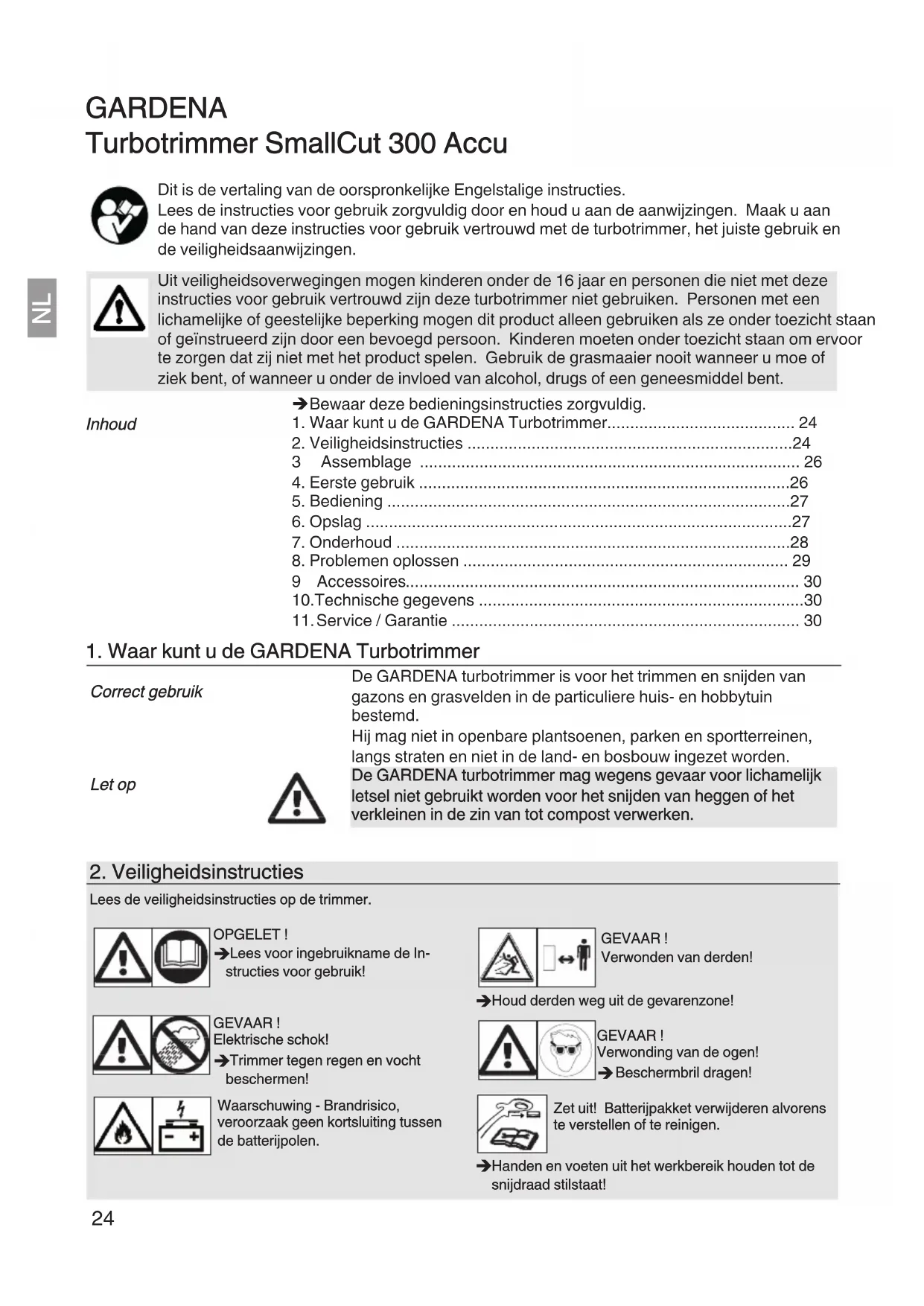 Bobine de fil de coupe pour coupe bordures SmallCut 300 Accu Art 5306 GARDENA Batterie de rechange Accu pour un temps de fonctionnement Art. 8834 NiMH 18V GARDENA supplémentaire ou pour remplacement avec 1,6 Ah (env. 60 min.)NL GARDENA Turbotrimmer SmallCut 300 Accu Dit is de vertaling van de oorspronkelijke Engelstalige instructies. Lees de instructies voor gebruik zorgvuldig door en houd u aan de aanwijzingen. Maak u aan de hand van deze instructies voor gebruik vertrouwd met de turbotrimmer, het juiste gebruik en de veiligheidsaanwijzingen. Uit veiligheidsoverwegingen mogen kinderen onder de 16 jaar en personen die niet met deze instructies voor gebruik vertrouwd zijn deze turbotrimmer niet gebruiken. Personen met een lichamelijke of geestelijke beperking mogen dit product alleen gebruiken als ze onder toezicht staan of geïnstrueerd zijn door een bevoegd persoon. Kinderen moeten onder toezicht staan om ervoor te zorgen dat zij niet met het product spelen. Gebruik de grasmaaier nooit wanneer u moe of ziek bent, of wanneer u onder de invloed van alcohol, drugs of een geneesmiddel bent. Bewaar deze bedieningsinstructies zorgvuldig.