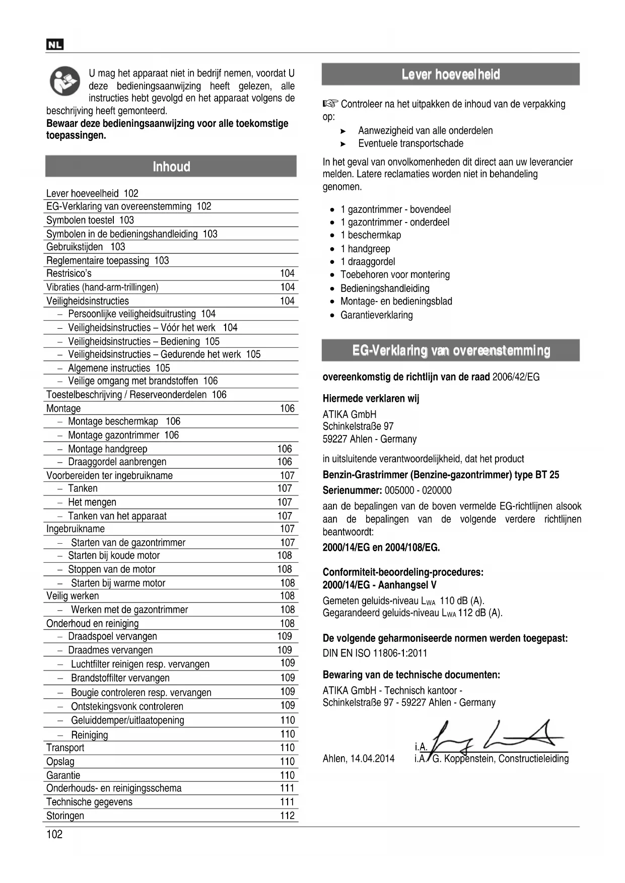 | Gegarandeerd geluidsniveau LWA 112 dB (A) (volgens richtlijn 2000/14/EG) | |