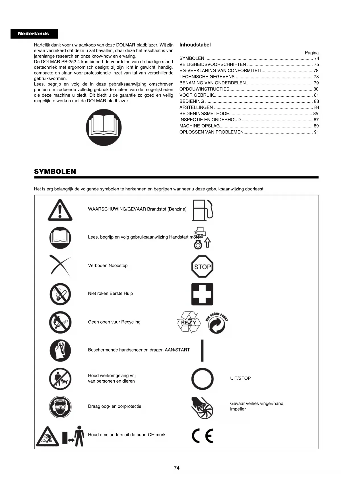 Ga eerst zelf na wat er aan de hand zou kunnen zijn voor u om een reparatie gaat verzoeken. Als u iets abnormaals vindt, voer dan de handelingen beschreven in deze handleiding uit. Knoei niet met onderdelen en demonteer geen onderdelen als dat niet in de handleiding beschreven wordt. Neem contact op met een erkende onderhoudsmonteur of uw dealer voor eventuele reparaties. Wanneer de motor niet start na het opwarmen: Als u geen problemen vindt via de bovenstaande controles, dient u het gas ongeveer 1/3 open te zetten en vervolgens de motor te starten. Probleem Waarschijnlijke oorzaak (storing) Oplossing De motor start niet U kunt de opvoerpomp niet gebruiken. Druk 7 tot 10 keer op de opvoerpomp. Er wordt niet snel genoeg aan de trekstarter getrokken. Trek harder. Niet genoeg brandstof. Ga tanken. Brandstoffilter verstopt. Reinigen Brandstofleiding geknakt of kapot. Haal de knik eruit of vervang de brandstofleiding. Slechte brandstof. Als de brandstof oud of slecht is, is de motor moeilijker te starten. Gebruik verse brandstof. (Ververs de brandstof in de tank minstens een keer per maand.) Te grote toevoer van brandstof (verzuipen). Zet de gashendel op halve of hoge snelheid en trek aan de trekstarter totdat de motor start. Als de motor nog steeds niet wil starten, dient u de bougie eruit te draaien, af te drogen en weer in te draaien. Start de motor vervolgens zoals beschreven. Losse bougiedop. Maak het stekkertje vast. Vuile bougie. Reinigen Abnormale elektrodenafstand. Stel de afstand tussen de elektroden van de bougie bij. Andere problemen met de bougie. Vervang de bougie. Problemen met de carburateur. Verzoek om inspectie en onderhoud. De trekstarter werkt niet. Verzoek om inspectie en onderhoud. Problemen met de overbrenging. Verzoek om inspectie en onderhoud. Motor valt stil. Motorsnelheid neemt niet toe. Niet genoeg opgewarmd. Laat de motor eerst opwarmen. De chokehendel staat op “CLOSE” (dicht), alhoewel de motor al opgewarmd is. Zet de chokehendel op “OPEN Brandstoffilter verstopt. Reinigen Luchtfilter verstopt of verontreinigd. Reinigen Problemen met de carburateur. Verzoek om inspectie en onderhoud. Problemen met de overbrenging. Verzoek om inspectie en onderhoud. Gaskabel losgeraakt Maak het stekkertje vast. Problemen met de overbrenging. Verzoek om inspectie en onderhoud. De motor stopt niet. Stekkertje los. Maak het stekkertje vast. Problemen met het elektrische systeem. Verzoek om inspectie en onderhoud. Laat de motor stationair lopen en zet de chokehendel op CLOSE (dicht).92 Español Muchas gracias por comprar el soplador DOLMAR. Nos complace recomendarle el uso del soplador DOLMAR que es el resultado de un extenso programa de investigación desarrollado tras años de estudio y experiencia. Los sopladores PB-252.4 combinan las ventajas del diseño más avanzado con un diseño ergonómico. Son muy ligeros, manejables, compactos y suponen un material profesional para una amplia variedad de aplicaciones. Por favor lea el folleto que hace referencia con detalle a los diversos puntos que demuestran su excelente funcionamiento. Esto le ayudará a obtener el mejor resultado posible de su soplador DOLMAR. Contenidos Página SÍMBOLOS ........................................................................................ 92