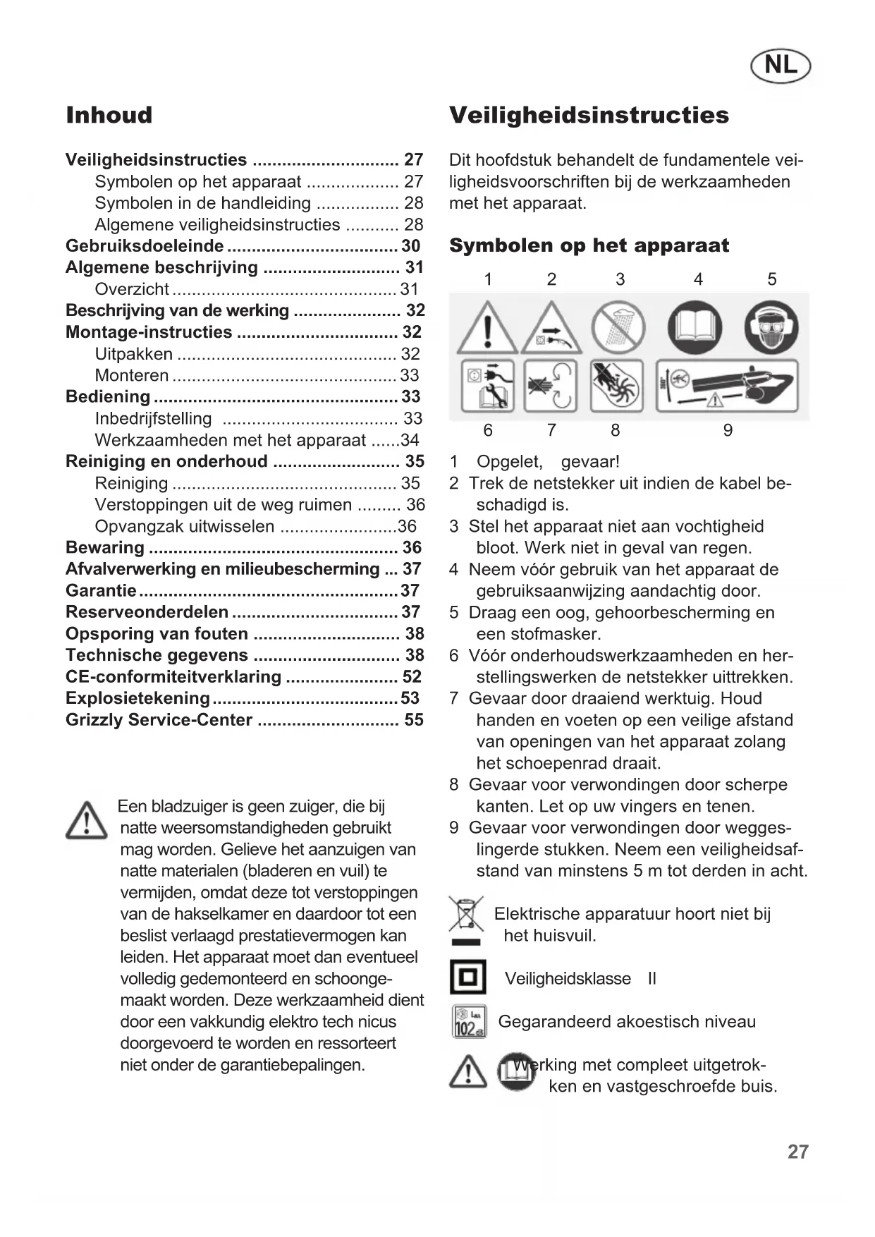 Een bladzuiger is geen zuiger, die bij natte weersomstandigheden gebruikt mag worden. Gieve het aanzuigen van natte materialen (bladeren en vuil) te vermijden, waar deze tot verstoppen van de hakselkamer en daardoor tot een beslist verlaagd prestatievermogen kan leiden. Het apparaat要去 dan eventuele volledig gedemonteerd en schoongemaakt worden. Deze werkzaamheid dient door een vakkundig elektro tech nicus doorgevoerd te worden en ressorteert nicht onder de garantiebepalingen.