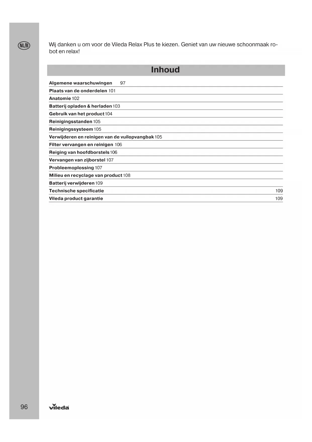 Wij danken u om voor de Vileda Relax Plus te kiezen. Geniet van uw nieuwe schoonmaak ro- bot en relax! Inhoud Algemene waarschuwingen 97 Plaats van de onderdelen 101 Anatomie 10 2 Batterij opladen & herladen 10 3 Gebruik van het product 10 4 Reinigingsstanden 10 5 Reinigingssysteem 10 5 Verwijderen en reinigen van de vuilopvangbak 10 5 Filter vervangen en reinigen 106 Reiging van hoofdborstels 106 Vervangen van zijborstel 107 Probleemoplossing 107 Milieu en recyclage van product 10 8 Batterij verwijderen 10 9 Technische specificatie 10 9 Vileda product garantie 10 997