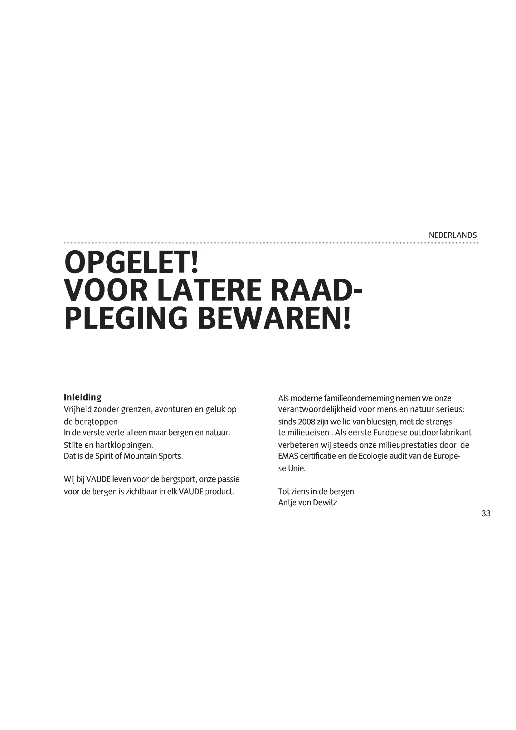 PLEGING BEWAREN! Inleiding Vrijheid zonder grenzen, avonturen en geluk op de bergtoppen In de verste verte alleen maar bergen en natuur. Stilte en hartkloppingen. Dat is de Spirit of Mountain Sports. Wij bij VAUDE leven voor de bergsport, onze passie voor de bergen is zichtbaar in elk VAUDE product. Als moderne familieonderneming nemen we onze verantwoordelijkheid voor mens en natuur serieus: sinds 2008 zijn we lid van bluesign, met de strengs- te milieueisen . Als eerste Europese outdoorfabrikant verbeteren wij steeds onze milieuprestaties door de EMAS certificatie en de Ecologie audit van de Europe- se Unie. Tot ziens in de bergen Antje von Dewitz34 NEDERLANDS KIeS je KampeerpLaatS: