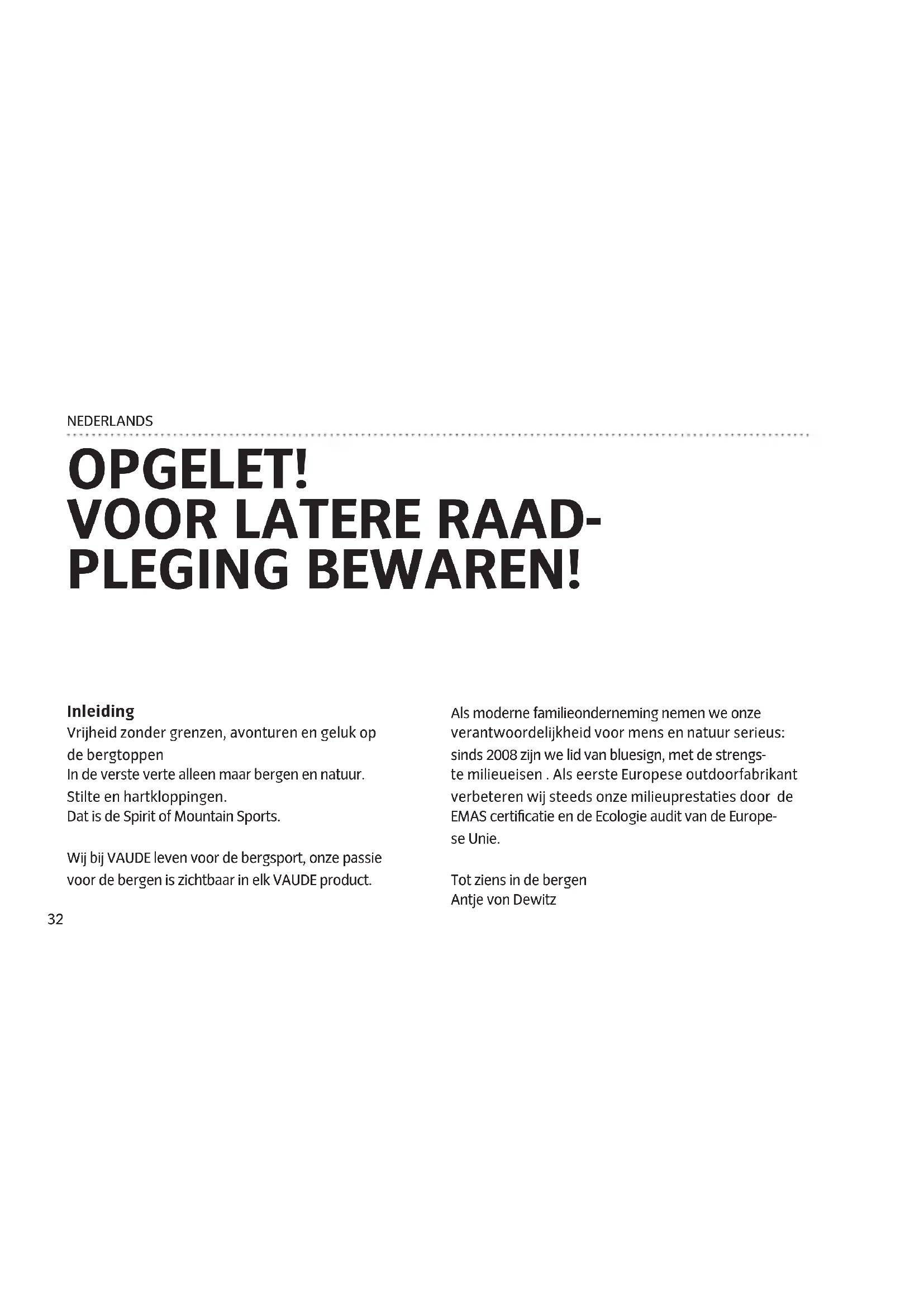 PLEGING BEWAREN! Inleiding Vrijheid zonder grenzen, avonturen en geluk op de bergtoppen In de verste verte alleen maar bergen en natuur. Stilte en hartkloppingen. Dat is de Spirit of Mountain Sports. Wij bij VAUDE leven voor de bergsport, onze passie voor de bergen is zichtbaar in elk VAUDE product. Als moderne familieonderneming nemen we onze verantwoordelijkheid voor mens en natuur serieus: sinds 2008 zijn we lid van bluesign, met de strengs- te milieueisen . Als eerste Europese outdoorfabrikant verbeteren wij steeds onze milieuprestaties door de EMAS certificatie en de Ecologie audit van de Europe- se Unie. Tot ziens in de bergen Antje von Dewitz33 NEDERLANDS KiES jE KaMpEErplaaTS:
