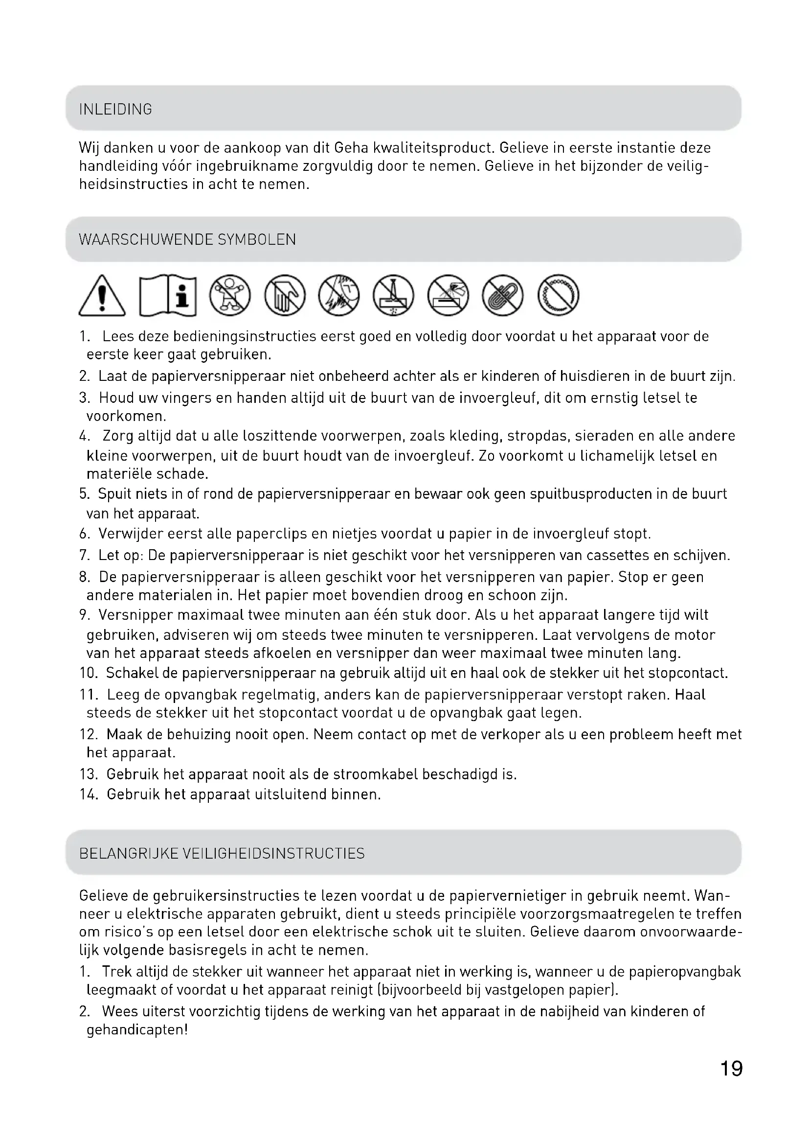Gelieve de gebruikersinstructies te lezen voordat u de papiervernietiger in gebruik neemt. Wanneer u elektrische apparaten gebruikt, dient u steeds principiële voorzorgs- maatregelen te treen om risico’s op een letsel door een elektrische schok uit te sluiten. Gelieve daarom onvoorwaardelijk volgende basisregels in acht te nemen.
