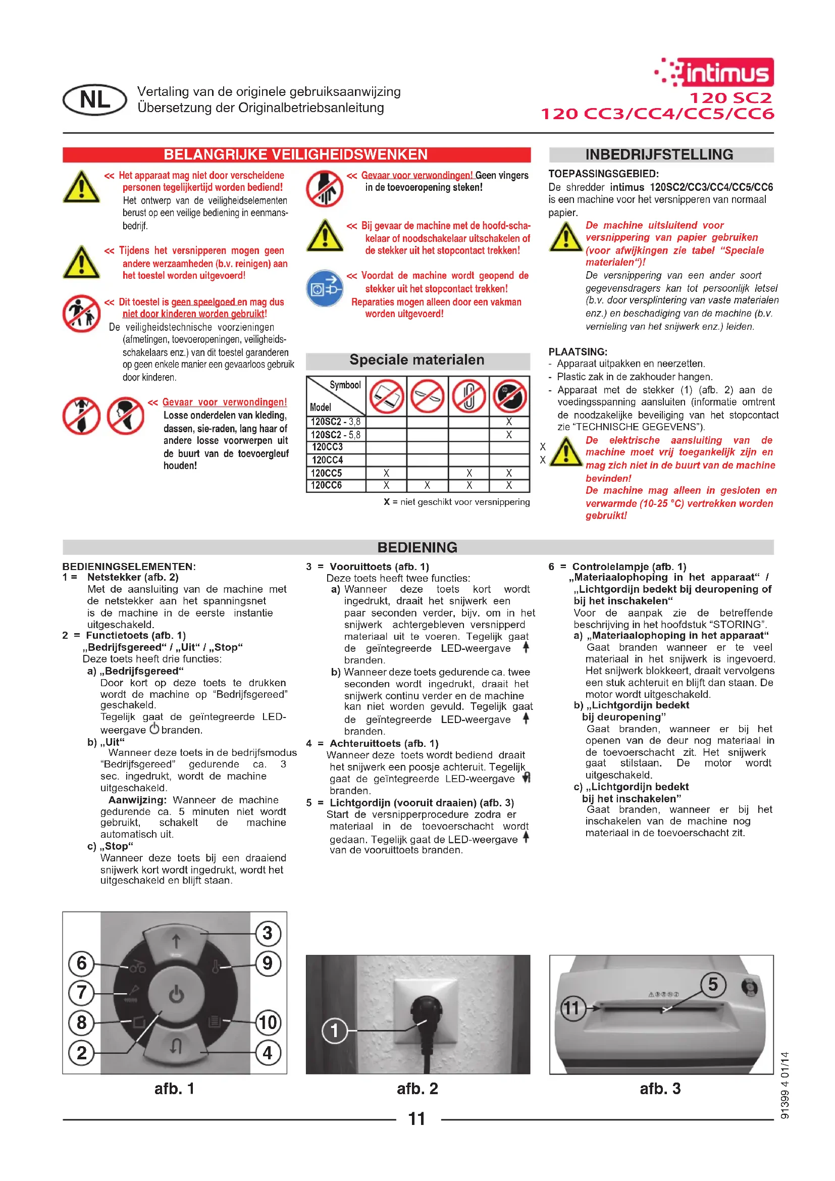 TECHNISCHE GEGEVENS SPECIALE TOEBEHOREN Benaming Best. nr.Plastic zak, 440x330x950x0,05 mm 99977Flesje olie, 110 ml 88035 Opmerking: Voor het nabestellen van speciale to- ebehoren en voor reserveonderdelen kunt u bij uw dealer terecht. ONDERHOUD / AFDANKEN STORING REINIGING VAN DE FOTOCELLEN (afb. 5):Wanneer er stukken papier in de invoerspleet terecht komen (bijv. na een papierophoping) is het mogelijk dat het apparaat vanwege een “bedekt” lichtgordijn niet meer uitschakelt. U kunt de stukken papier verwijderen of de fotocel reinigen door nog een vel papier in het snijwerk te doen of de machine op achteruitdraaien zetten en met een kwastje even over de “ogen” van de fotocel te vegen.ONDERHOUD SNIJWERK (CROSS CUT):Cross-Cut-snijwerken moeten na een bepaalde tijd van werking met olie worden ingesmeerd. Wanneer de controleweergave (7) gaat branden, gaat u als volgt te werk: Deur openen. Het controlelampje (8) gaat branden en de LED-weergave van de achteruittoets (4) en het controlelampje (7) knipperen. Oliereservoir (13) (afb. 6) uit de houder in de deur halen en de deur weer sluiten. Verdeel iets olie op een vel papier en voer het vervolgens door de papierschacht (11) het snijwerk in. Het papier wordt ingetrokken en de olie komt op die manier in het snijwerk terecht.Aanwijzing: Om de weergave te wissen moet na het uitvoeren van de oliesmering van het snijwerk deze procedure als volgt worden bevestigd:- Open de deur zo ver tot het controlelampje (8) gaat branden. De controlelampjes (7) en (4) knipperen.afb. 5afb. 6 Vertaling van de originele gebruiksaanwijzing Übersetzung der Originalbetriebsanleitung MATERIAALOPHOPING IN HET APPARAAT:(Auto-Reverse-functie)Wanneer er door te veel toevoer materiaal vast loopt, reageert de machine als volgt:- Het snijwerk blokkeert, draait vervolgens een stuk achteruit (materiaal wordt vrijgegeven) en blijft dan staan. De motor wordt uitgeschakeld. Het controlelampje (6) gaat branden.Ga als volgt te werk:Papier loopt vast in de papiertoevoerschacht (11) - Teruggevoerd papier uitnemen. - Snijwerk draait automatisch vooruit en versnippert de rest papier die nog in het snijwerk zit. Tijdens het vooruitdraaien brandt de LED-weergave van de vooruittoets (3). Het controlelampje (6) dooft.- Ga door met het versnipperen van kleinere papierhoeveelheden. - Indien noodzakelijk moet het snijwerk handmatig afwisselend zo lang voor- en achteruit worden geschakeld tot het materiaal volledig is doorgedraaid en versnipperd.LICHTGORDIJN BELEGD BIJ DEUROPENING:Wanneer er zich bij het openen van de deur nog materiaal in de toevoerschacht bevindt, schakelt de motor uit en het snijwerk stopt. Het controlelampje (6) gaat branden.Sluit de deur en bevestig de situatie door kort op de vooruittoets (3) te drukken. Het aanwezige materiaal wordt naar het snijwerk geleid en versnipperd.LICHTGORDIJN BELEGD BIJ HET INSCHAKELEN:Mocht er bij het inschakelen van de machine materiaal in de toevoerschacht zitten, gaat het controlelampje (6) branden.Verwijder het materiaal en bevestig de situatie door kort op de vooruittoets (3) te drukken.MOTORBEVEILIGING: Mocht de motor overbelast worden, schakelt hij uit. Het controlelampje (9) gaat branden.Na een afkoelfase van ca. 25-40 minuten kunt u het apparaat opnieuw opstarten.ELEKTRISCHE STORING:Wanneer de controleweergave (9) samen met de LED-weergave van de functieschakelaar (2) of alleen de controleweergave (8) knippert, is er sprake van een elektrische storing. De machine kan niet worden opgestart.Neem in dit geval contact op met uw dealer.CHECKLIJST BIJ STORINGEN:Mocht het apparaat niet functioneren, dient u de volgende punten te controleren: - is de netstekker aan het spanningsnet aangesloten?- is de deur gesloten?- is de opvangzak voor papier vol? Volg de instructies vermeld bij „LEDIGEN VAN DE OPVANGZAK VOOR PAPIER“.- is er materiaal vastgelopen in het apparaat? Vo l g d e i n s t r uc ti e s v e r m e ld b ij “MATERIAALOPHOPING IN HET APPARAAT”.- is de motor overbelast? Zie “MOTORBEVEILIGING”.Wanneer geen van de te controleren punten van toepassing zijn, neem dan contact op met uw dealer. Model Type Snijbreedte Capaciteit Werkbreedte Geluidsniveau Afmetingen Gewicht papier papier B x D x H intimus 120SC2 227-6S 5,8 mm 35-38 blad* 310 mm ca. 57 dB(A) 535 x 395 x 980 mm 46 kg intimus 120SC2 227-4S 3,8 mm 31-33 blad* 310 mm ca. 57 dB(A) 535 x 395 x 980 mm 46 kg intimus 120CC3 227-4C 3,8x38 mm 23-25 blad* 310 mm ca. 57 dB(A) 535 x 395 x 980 mm 47 kg intimus 120CC4 227-2C 1,9x15 mm 15-17 blad* 310 mm ca. 57 dB(A) 535 x 395 x 980 mm 47 kg intimus 120CC5 227-1C 0,8x12 mm 10-12 blad* 310 mm ca. 57 dB(A) 535 x 395 x 980 mm 47 kg intimus 120CC6 227-1CF 0,8x4,5 mm 7-8 blad* 310 mm ca. 57 dB(A) 535 x 395 x 980 mm 47 kg Model Gegevens aansluiting stroomnet spanning/frequentie · inkomende stroom · vermogen intimus 120SC2 220-230V/50Hz · 7,8 A · 1,8 kW 115-125V/60Hz · 12,0 A · 1,4 kW 100V/50/60Hz · 18,0 A · 1,8 kW intimus 120SC2 220-230V/50Hz · 7,8 A · 1,8 kW 115-125V/60Hz · 12,0 A · 1,4 kW 100V/50/60Hz · 18,0 A · 1,8 kW intimus 120CC3 220-230V/50Hz · 7,8 A · 1,8 kW 115-125V/60Hz · 12,0 A · 1,4 kW 100V/50/60Hz · 18,0 A · 1,8 kW intimus 120CC4 220-230V/50Hz · 7,8 A · 1,8 kW 115-125V/60Hz · 12,0 A · 1,4 kW 100V/50/60Hz · 18,0 A · 1,8 kW intimus 120CC5 220-230V/50Hz · 7,8 A · 1,8 kW 115-125V/60Hz · 12,0 A · 1,4 kW 100V/50/60Hz · 18,0 A · 1,8 kW intimus 120CC6 220-230V/50Hz · 7,8 A · 1,8 kW 115-125V/60Hz · 12,0 A · 1,4 kW 100V/50/60Hz · 18,0 A · 1,8 kW
