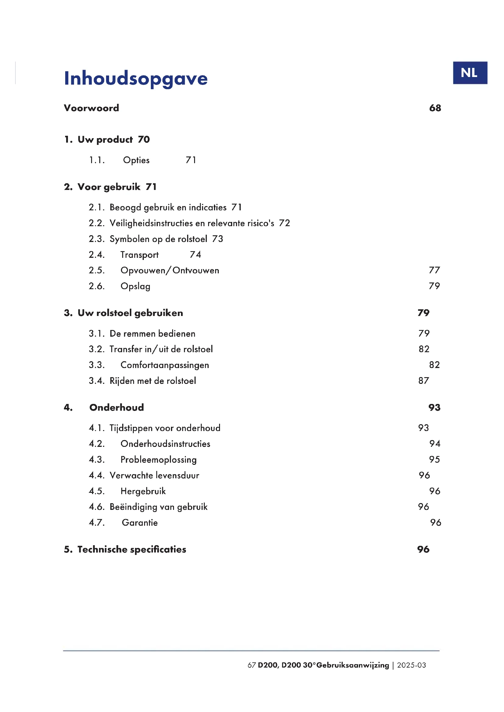 Gebruiksaanwijzing Voor gebruiker en vakhandelaar Installatiehandleiding Voor de vakhandelaar Servicehandleiding voor rolstoelen Voor de vakhandelaar EC-conformiteitsverklaring70Gebruiksaanwijzing | 2025-03 D200, D200 30°