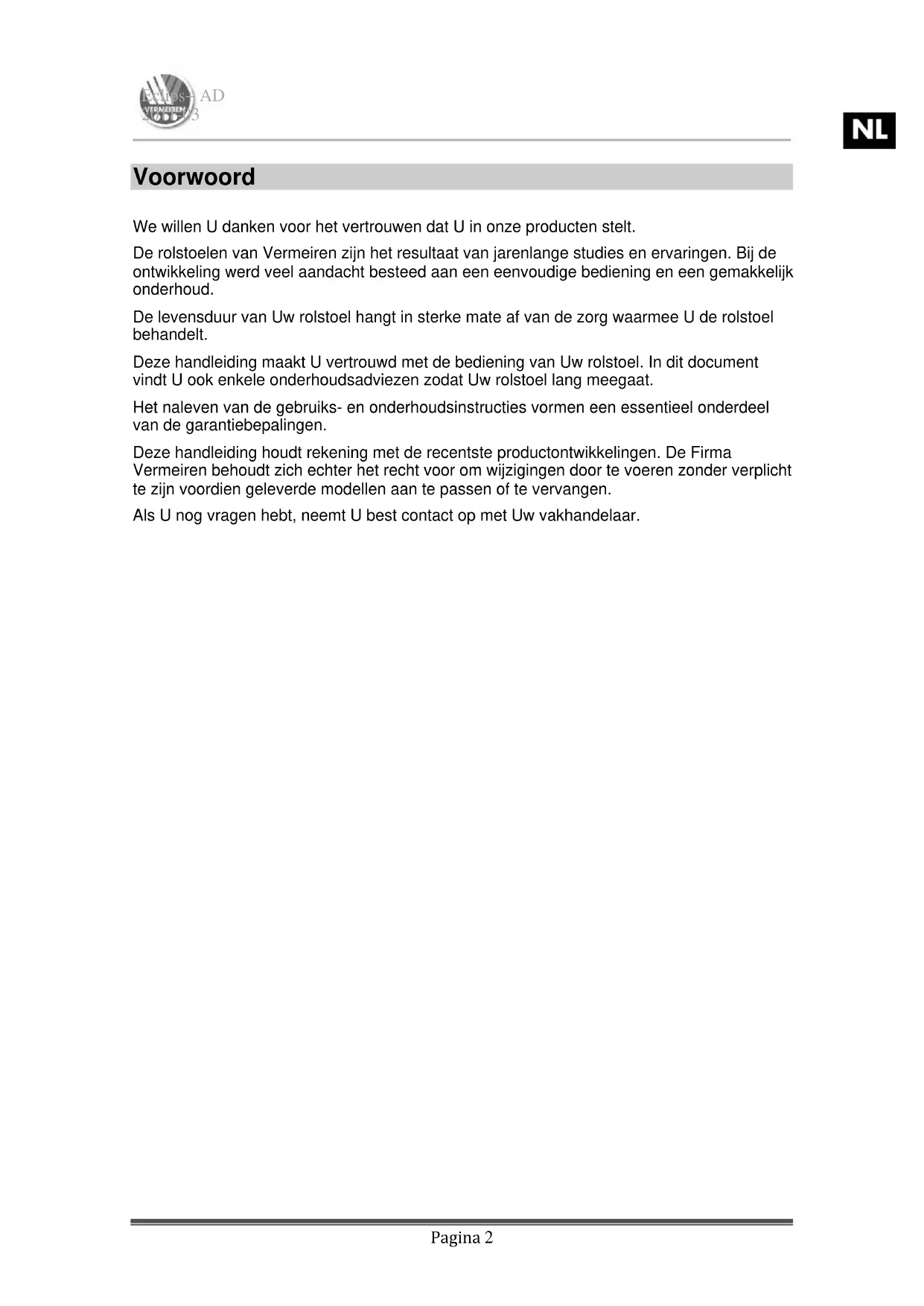 De rolstoel is bedoeld voor mensen die moeilijk of niet kunnen lopen. De rolstoel is ontworpen voor het transport van 1 persoon. De rolstoel kan zowel binnenshuis als buiten gebruikt worden. De gebruiker kan de rolstoel zelf voortbewegen of laten duwen door een begeleider. De rolstoel biedt door zijn modulaire opbouw verschillende aanpassingsmogelijkheden voor mensen die moeilijk kunnen lopen door: verlamming verlies van ledematen (beenamputatie) defect of aandoeningen van ledematen contracturen en gewrichtsaandoeningen hart- en bloedsomloopinsufficiëntie evenwichtsstoornissen cachexie (afname van het spierweefsel) geriatrische patiënten Hou bij de individuele verzorging rekening met: grootte en lichaamsgewicht (max. 130 kg) fysieke en psychische gesteldheid woonomgeving milieu Uw rolstoel mag alleen gebruikt worden op ondergronden waarbij alle vier de wielen de grond raken en waarbij het bodemcontact voldoende is voor een gelijkmatige aandrijving van alle wielen. Extra oefening is nodig voor het rijden op ongelijkmatige ondergrond (kasseien, etc.), hellingen en bochten (zijdelings omvallen), evenals het nemen van hindernissen (bvb. Trottoirranden). De rolstoel dient niet als klimtoestel of om hete of zware voorwerpen te transporteren. Het gebruik van de rolstoel op tapijten, tapijtvloeren of andere losse vloerbedekkingen kan slijtage van de vloerbedekking tot gevolg hebben. Gebruik enkel door Vermeiren goedgekeurde accessoires. Vermeiren is niet aansprakelijk voor schade door gebrekkig of onvoldoende onderhoud of als gevolg van het niet naleven van instructies van deze handleiding. Het naleven van de gebruiks- en onderhoudsinstructies vormen een essentieel onderdeel van de garantiebepalingen.NL Eclips+ AD 2011-03 !"#$%"&4&
