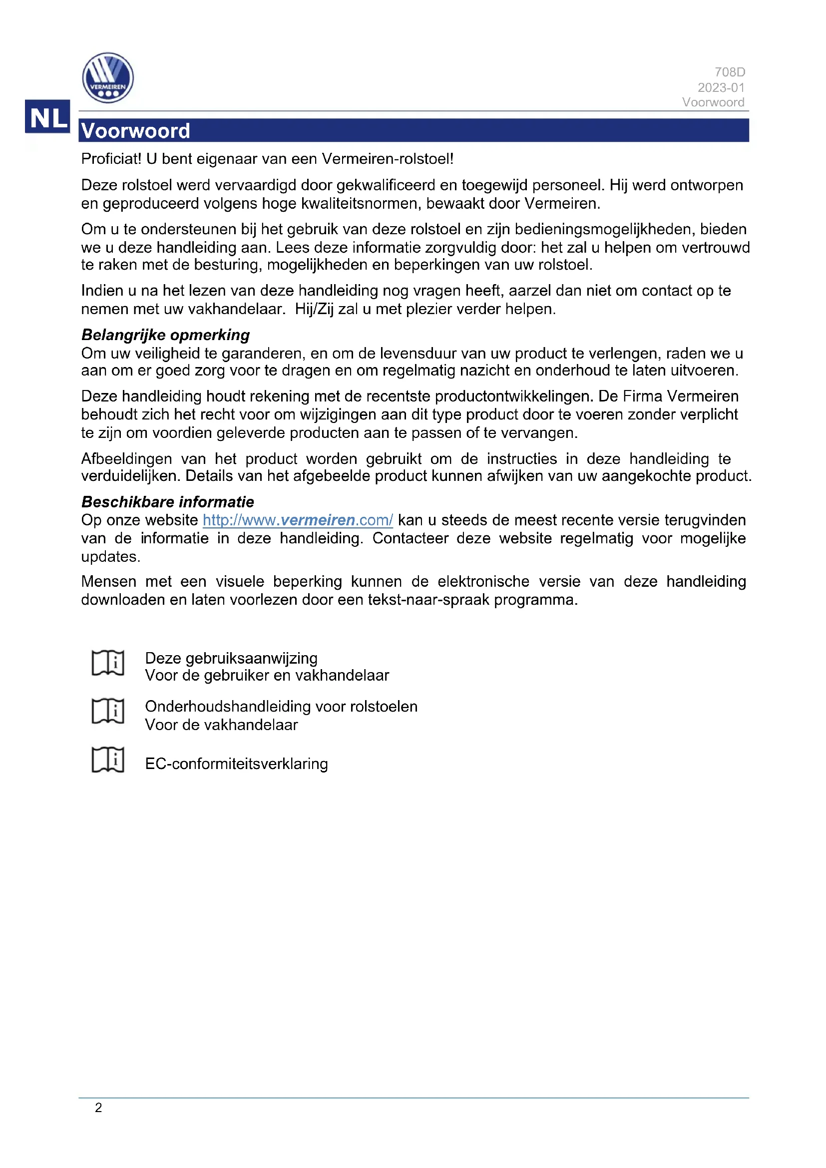 Voorwoord Proficiat! U bent eigenaar van een Vermeiren-rolstoel! Deze rolstoel werd vervaardigd door gekwalificeerd en toegewijd personeel. Hij werd ontworpen en geproduceerd volgens hoge kwaliteitsnormen, bewaakt door Vermeiren. Om u te ondersteunen bij het gebruik van deze rolstoel en zijn bedieningsmogelijkheden, bieden we u deze handleiding aan. Lees deze informatie zorgvuldig door: het zal u helpen om vertrouwd te raken met de besturing, mogelijkheden en beperkingen van uw rolstoel. Indien u na het lezen van deze handleiding nog vragen heeft, aarzel dan niet om contact op te nemen met uw vakhandelaar. Hij/Zij zal u met plezier verder helpen. Belangrijke opmerking Om uw veiligheid te garanderen, en om de levensduur van uw product te verlengen, raden we u aan om er goed zorg voor te dragen en om regelmatig nazicht en onderhoud te laten uitvoeren. Deze handleiding houdt rekening met de recentste productontwikkelingen. De Firma Vermeiren behoudt zich het recht voor om wijzigingen aan dit type product door te voeren zonder verplicht te zijn om voordien geleverde producten aan te passen of te vervangen. Afbeeldingen van het product worden gebruikt om de instructies in deze handleiding te verduidelijken. Details van het afgebeelde product kunnen afwijken van uw aangekochte product. Beschikbare informatie Op onze website http://www.vermeiren.com/ kan u steeds de meest recente versie terugvinden van de informatie in deze handleiding. Contacteer deze website regelmatig voor mogelijke updates. Mensen met een visuele beperking kunnen de elektronische versie van deze handleiding downloaden en laten voorlezen door een tekst-naar-spraak programma.