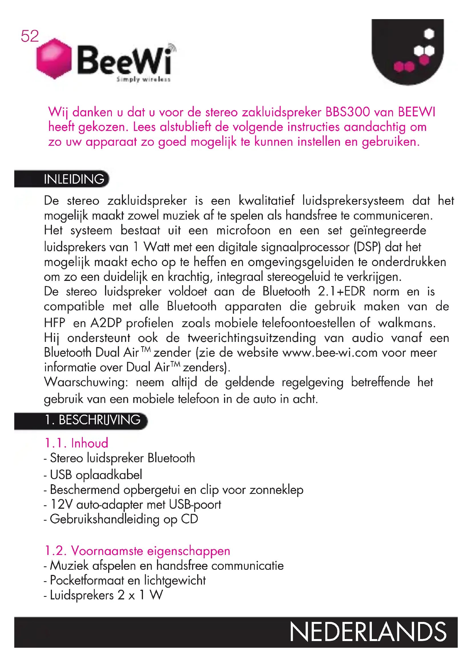 zenders). Waarschuwing: neem altijd de geldende regelgeving betreffende het gebruik van een mobiele telefoon in de auto in acht. 1.1. Inhoud - Stereo luidspreker Bluetooth - USB oplaadkabel - Beschermend opbergetui en clip voor zonneklep - 12V auto-adapter met USB-poort - Gebruikshandleiding op CD 1.2. Voornaamste eigenschappen - Muziek afspelen en handsfree communicatie - Pocketformaat en lichtgewicht - Luidsprekers 2 x 1 W INLEIDING Wij danken u dat u voor de stereo zakluidspreker BBS300 van BEEWI heeft gekozen. Lees alstublieft de volgende instructies aandachtig om zo uw apparaat zo goed mogelijk te kunnen instellen en gebruiken.